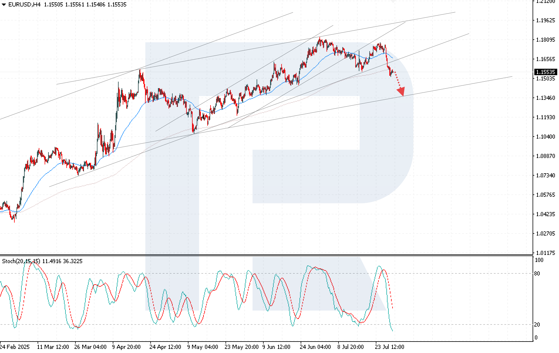 2025 жылғы 30 шілде күнгі болжам бойынша, баға 1.1355 деңгейіне дейін төмендеуі мүмкін – бұл негізгі каналдың төменгі шекарасы. Stochastic Oscillator көрсеткіштері де осы сценарийді растайды: сигнал сызықтары артық сатып алынған аймақтан шықты және төмен қарай бағытталған, бұл тұрақты сату қысымын білдіреді.