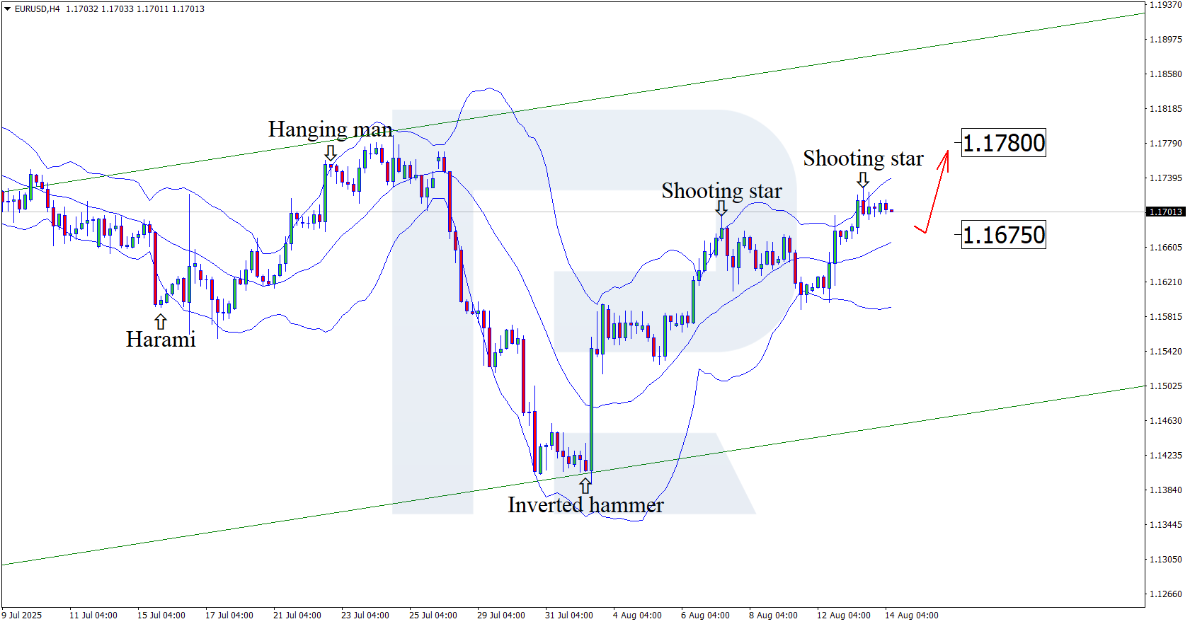 H4 графигінде EURUSD жұбы жоғарғы Bollinger Bands жолағы маңында «Атылған жұлдыз» (Shooting Star) кері бұрылу үлгісін қалыптастырды. Осы сәтте үлгінің сигналына сәйкес түзету толқынының дамуы мүмкін. Жұптың айтарлықтай өскенін ескерсек, жақын қолдау деңгейі — 1,1675-ке дейін кері шегіну ықтимал. Осы қолдаудан серпіліс өсу қозғалысының жалғасуына жол ашуы мүмкін.
