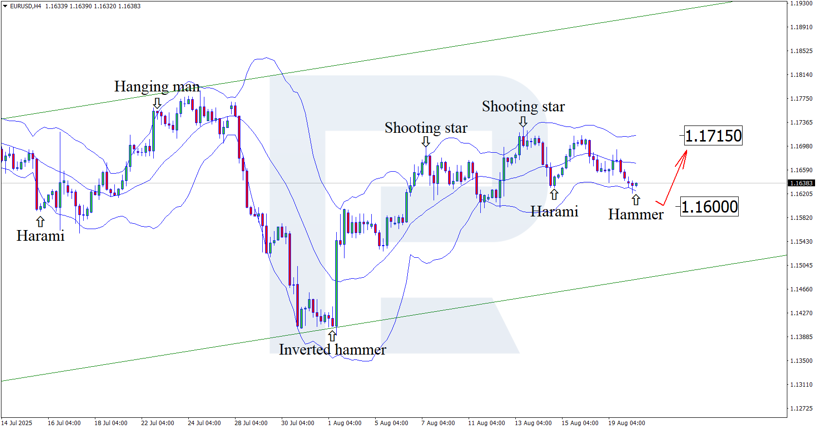H4 графигінде EURUSD жұбы төменгі Bollinger жолағы маңында Hammer кері бұрылу үлгісін қалыптастырды. Осы кезеңде баға сигналға сәйкес жоғары толқын қалыптастыруы мүмкін. Жуырдағы күрт төмендеуді ескере отырып, 1.1715 деңгейіндегі жақын қарсылыққа дейінгі түзету ықтимал. Бұл қарсылықтан жоғары шығу өсу үрдісінің жалғасуына жол ашады.