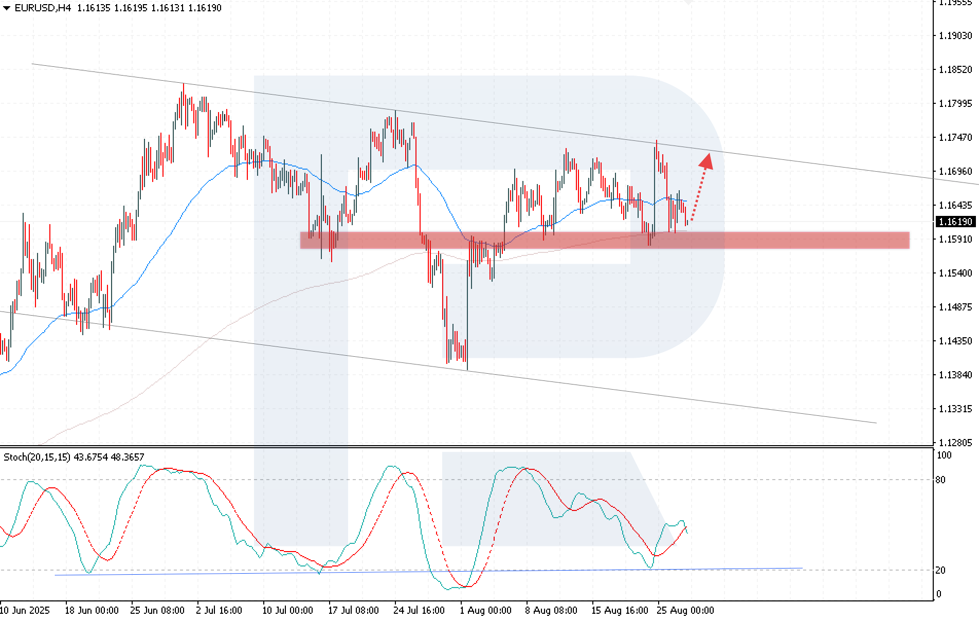 EURUSD бағамы 1.1595 қолдау деңгейінің үстінде саудалануда, сатып алу аймағынан серпіліп, төмендеу арнасының ішінде қалып отыр. Ағымдағы динамика 1.1705 деңгейіне дейінгі бұқа түзетуінің ықтималдығын көрсетеді.