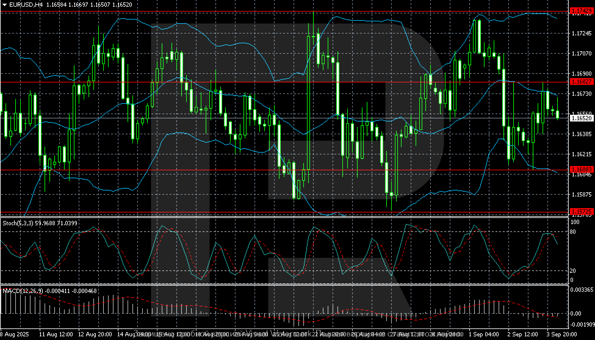 H4 графигінде EURUSD жұбы негізгі деңгейлермен шектелген диапазонда саудалануда. Қарсылық 1.1682 және 1.1742 деңгейлерінде тұр. Осы деңгейлерден жоғары көтерілу әрекеттері әзірге сәтсіз болды, себебі сатушылар әрекет етті. Қолдау 1.1608 және 1.1572-де орналасқан. Бұл аймақтар тамыз айында берік сақталды және сатып алушылар үшін әлі де маңызды.