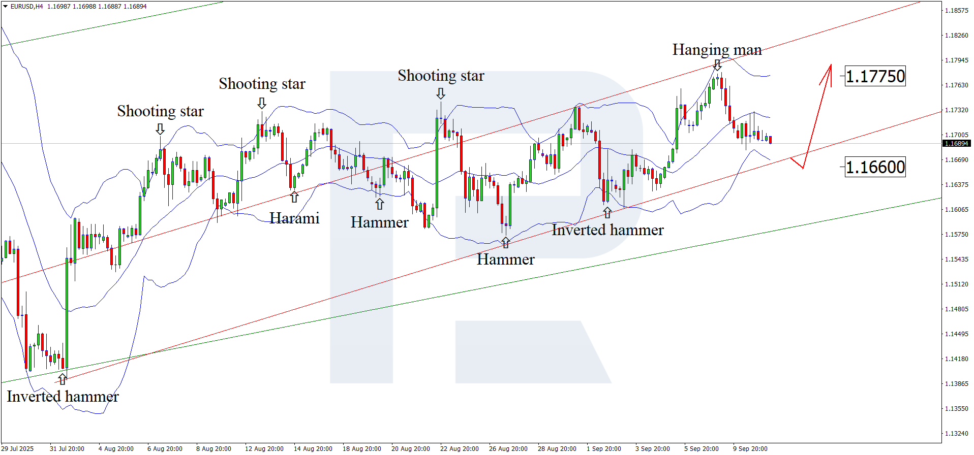 H4 графигінде EURUSD жұбы жоғарғы Bollinger Band маңында «Hanging Man» кері бұрылу үлгісін құрды. Осы сәтте жұп үлгі берген сигналға сәйкес төмендейтін толқынды жалғастыруда. Баға өрлемелі арна ішінде қалғандықтан, 1.1660 ең жақын қолдау деңгейіне дейін төмендеу мүмкіндігі бар. Осы аймақтан серпіліс өрлемелі трендтің жалғасуына жол ашады.