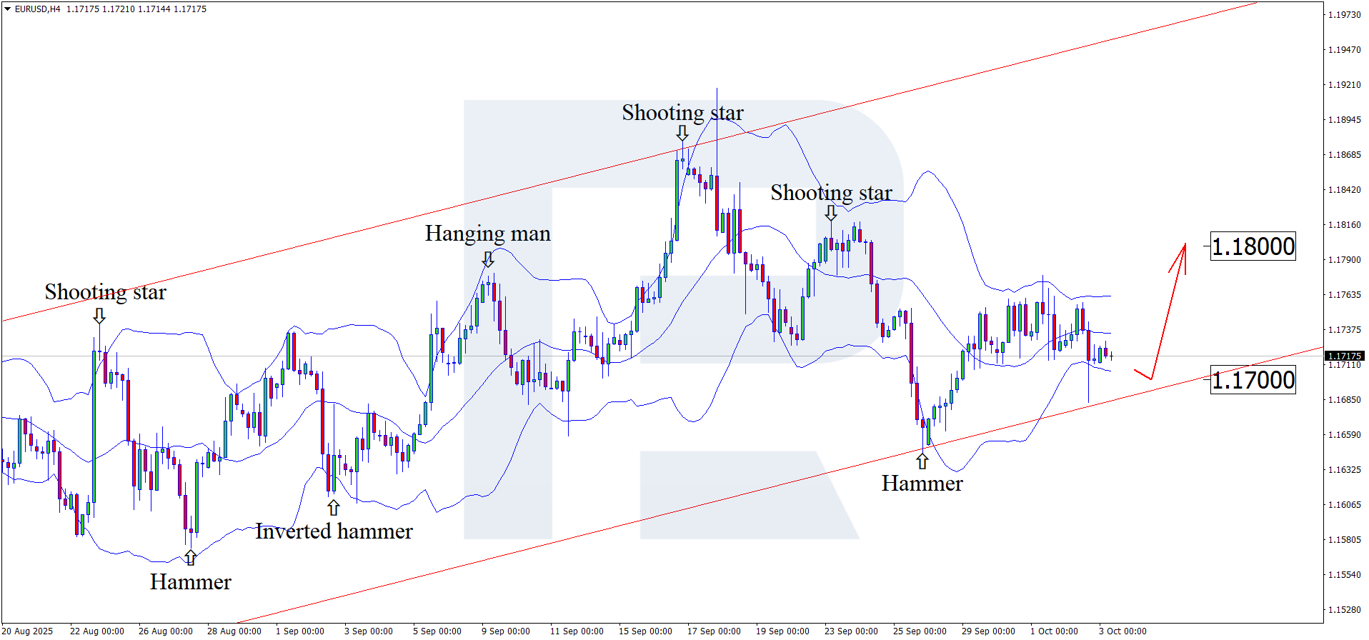 H4 графигінде EURUSD жұбы төменгі Bollinger Band маңында Hammer кері бұрылу үлгісін қалыптастырды. Осы кезеңде ол үлгі сигналына сәйкес «бұқалық» толқынды жалғастыруда. Бағалар өсіп келе жатқан арна ішінде тұрғандықтан, 1.1800 деңгейіндегі ең жақын қарсылыққа дейін көтерілу ықтималдығы сақталуда. Бұл деңгейден жоғары серпіліс одан әрі өсуге жол ашады.