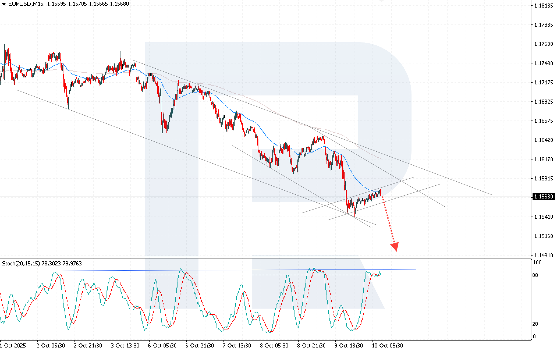 EURUSD болжамы төмендеу сценарийін көрсетеді, мақсатты деңгей — 1.1495. Қосымша растау Stochastic Oscillator көрсеткішінен байқалады — ол артық сатып алу аймағынан төмен бағытқа бұрылып, қысқа мерзімді «аюлы» импульстің ықтималдығын арттыруда.