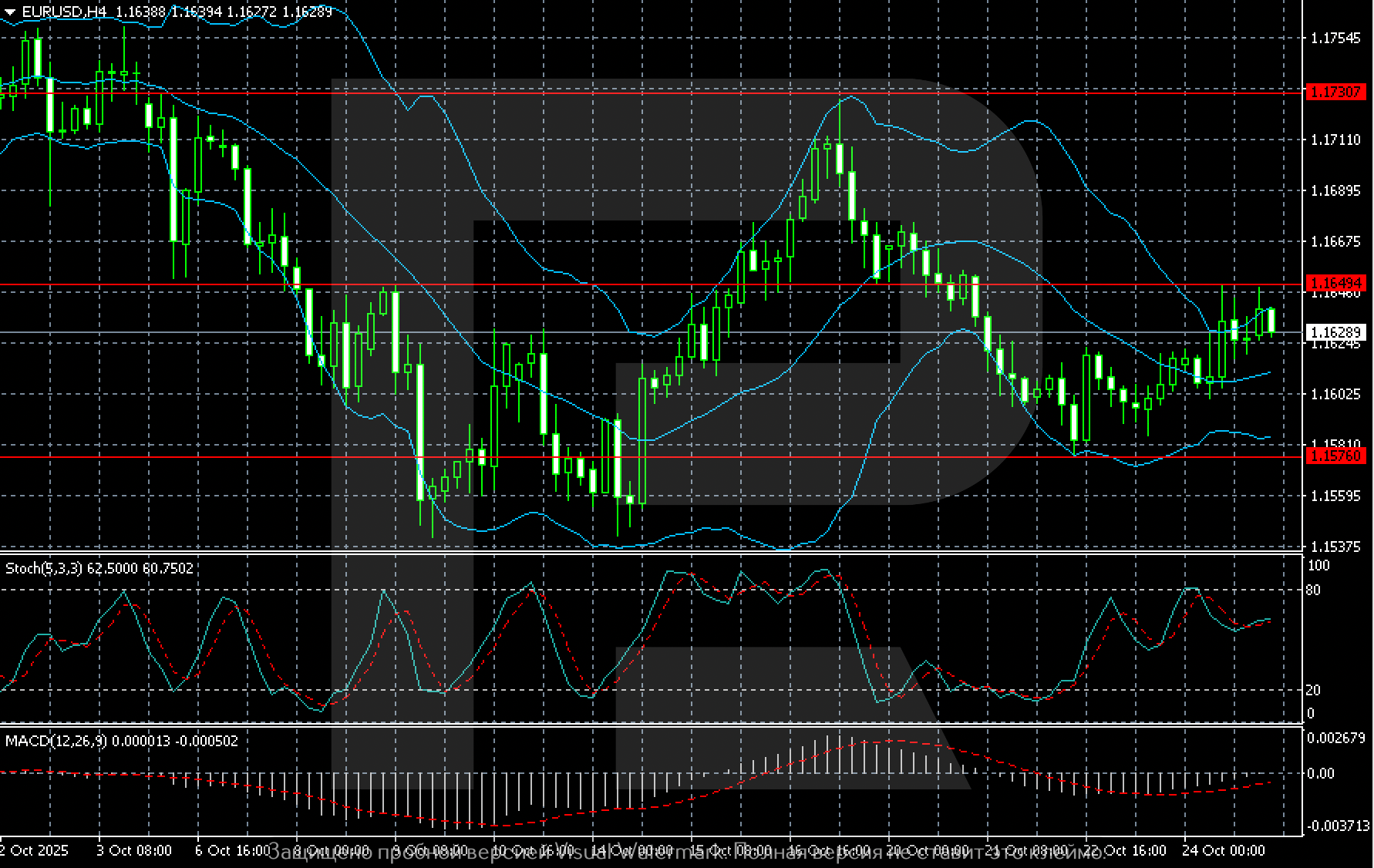 H4 графигінде EURUSD жұбы 1.1628 маңында саудалануда, қазан айының басындағы төмендеуден кейін консолидация кезеңінде тұр. Өткен аптадан бері жұп 1.1576 пен 1.1649 аралығындағы тар диапазонда қозғалып, нарықтағы бұқалар мен аюлар арасындағы тепе-теңдікті және белгісіздікті көрсетуде.