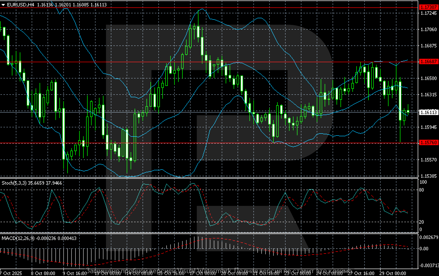 H4 графигінде EURUSD жұбы нарықтағы белгісіздікті бейнелейтін бүйірлік диапазонда саудалануды жалғастыруда. Қазан айының басындағы төмендеуден кейін жұп 1.1576 деңгейінен серпіліп, 1.1668 қарсылық маңын бірнеше рет сынағанымен, жоғары өтуде сәтсіз болды. Қазір баға шамамен 1.1610 деңгейінде шоғырланып тұр.