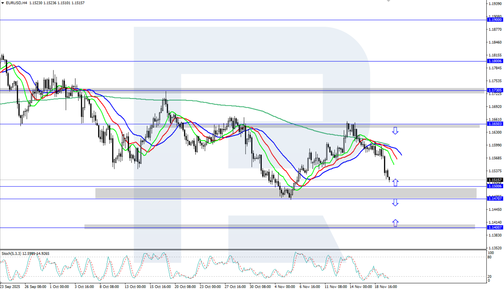 H4 графигінде EURUSD жұбы төмен бағытта қозғалып, 1.1500 қолдау деңгейіне түсті. Alligator индикаторы төмен бұрылуда. Егер баға 1.1500 деңгейінен жоғары тұра алмаса, төмендеу жалғасуы мүмкін.