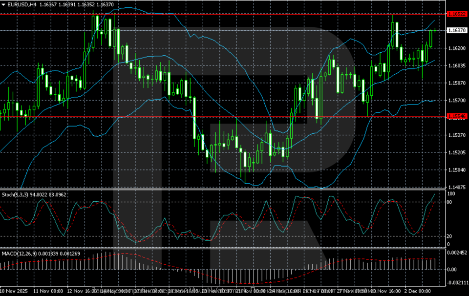 EURUSD жұбы жоғары бағытта қозғалып жатыр. 3 желтоқсан 2025 күнгі EURUSD болжамы 1.1652 деңгейін қайтадан бұзу әрекетінің жасалуын күтеді.