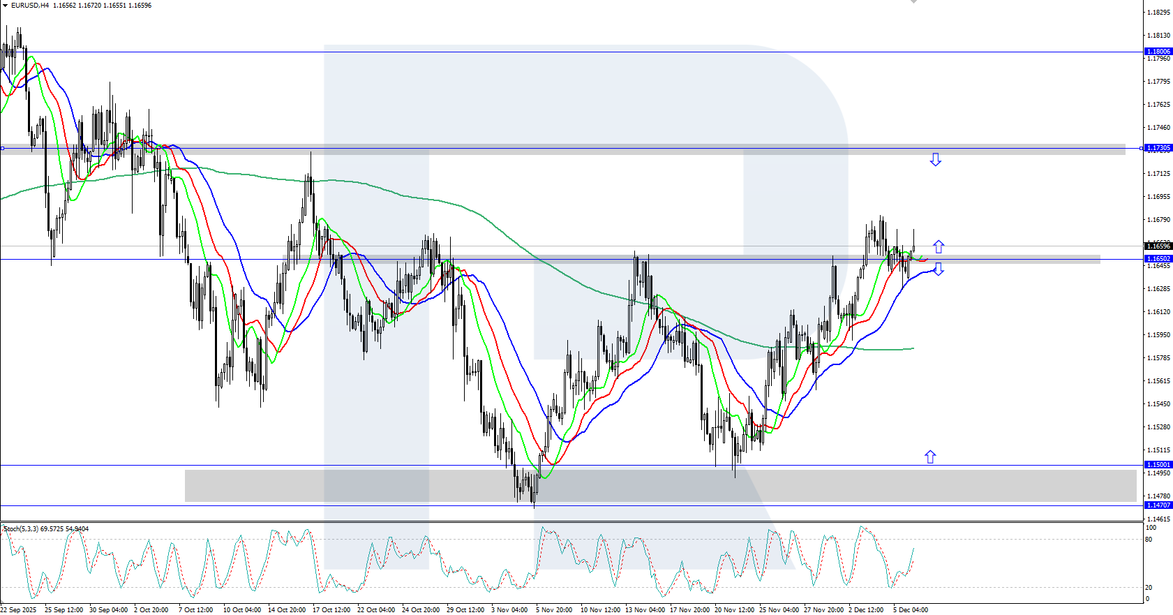 H4 графигінде EURUSD жұбы күшейіп, 1.1650 деңгейінен жоғары көтерілді. Alligator индикаторы да бағаға ілесе жоғары бағытталған, бұл еуроның өсу импульсінің жалғасуы мүмкін екенін көрсетеді. Негізгі қолдау аймағы — 1.1470–1.1500.