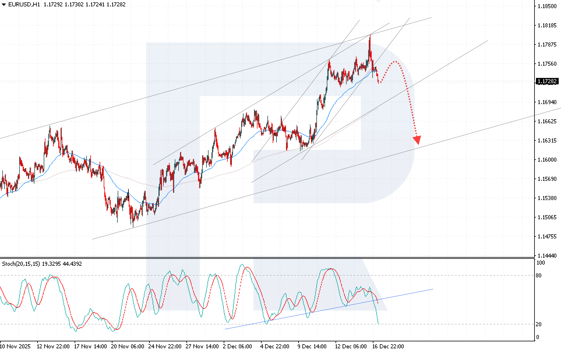Қосымша аюлы сигнал Stochastic Oscillator индикаторында қалыптасуда. Сигналдық сызықтар өсім тренд сызығынан төмен өтіп, аюлы қиылысу (bearish crossover) құрды, бұл төмен бағыттағы импульстың қайта жандануын көрсетеді.