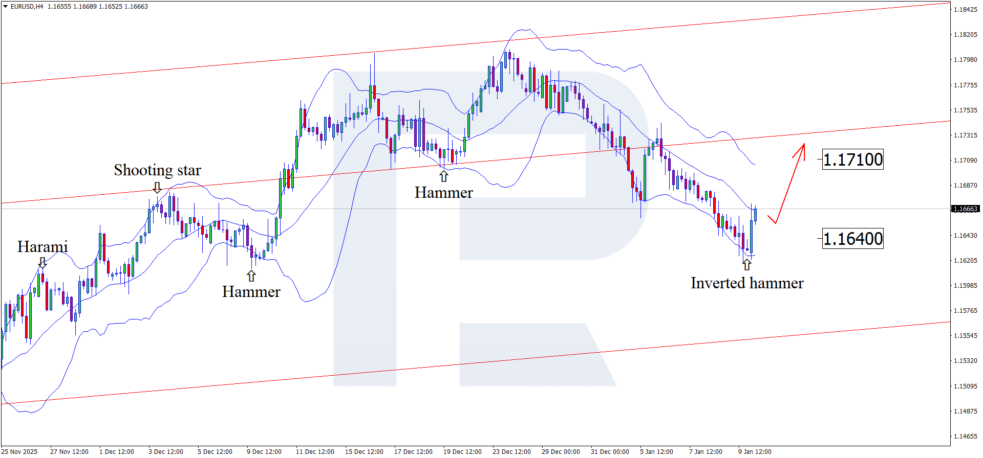H4 графигінде EURUSD жұбы Bollinger Bands төменгі жолағы маңында Inverted Hammer кері бұрылыс моделін қалыптастырды. Қазіргі кезеңде баға осы модель сигналына сәйкес жоғары бағытталған толқынды дамытып отыр. Котировкалар өсуші арна ішінде қалғандықтан, олар 1.1710 деңгейіне қарай жылжуы мүмкін. Осы деңгейден жоғары бұзылу өсім импульсінің жалғасуына жол ашады.