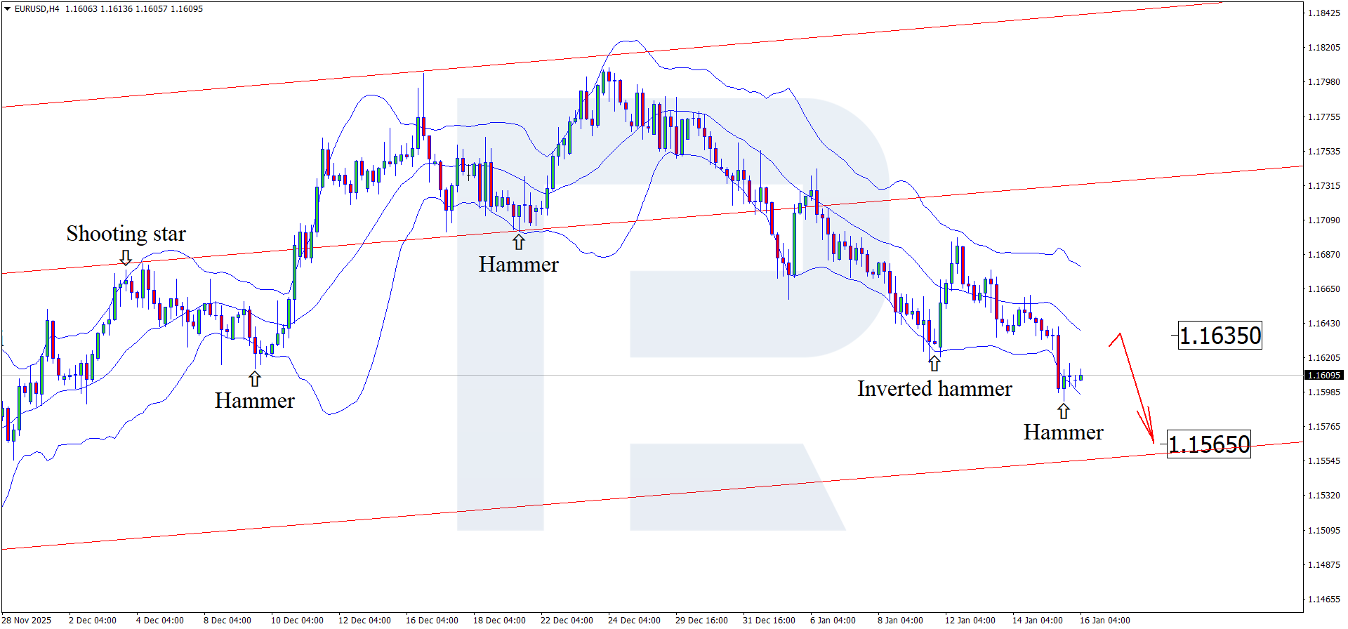 H4 графигінде EURUSD жұбы Bollinger Bands төменгі жолағы маңында Hammer қайтарымдық үлгісін қалыптастырды. Қазіргі кезеңде жұп осы үлгінің сигналына сәйкес түзетуші толқынды дамытып жатыр. Котировкалар өсуші арна шеңберінде қалғандықтан, олар 1.1635 деңгейіне қарай бағыт алуы мүмкін. Бұл деңгейді жоғары бұзу өсуші трендке жол ашуы ықтимал.