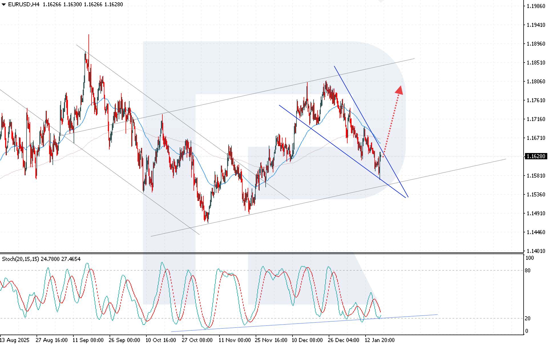 Бүгінгі күнге арналған EURUSD болжамы ағымдағы түзету фазасы аяқталғаннан кейін өсімді қалпына келтіру әрекетін меңзейді, мақсат — 1.1805. Техникалық индикаторлар бычий күтулердің сақталғанын растайды. Stochastic Oscillator артық сатылған аймақтан тағы да серпіліп, соңғы уақытта үшінші рет жоғары қарай бұрылды және бычий қиылысуға жағдай жасап отыр, бұл еуроны қайта сатып алу пайдасына сигналдарды күшейтеді.