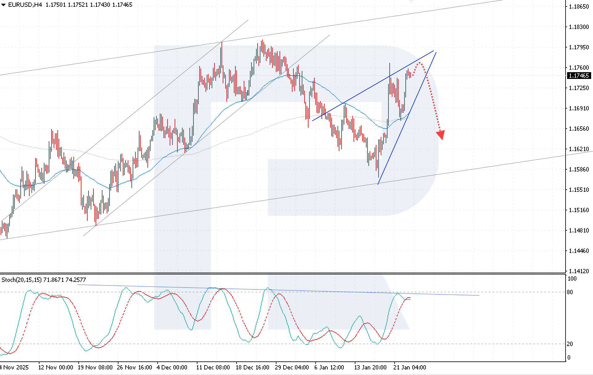 Бүгінгі EURUSD болжамы қайтарым үлгісінің іске асуына қарай 1.1645 деңгейіне төмендеуді болжайды. Қазіргі техникалық көрініс сатылым қысымының күшейіп келе жатқанын көрсетеді. Stochastic Oscillator аюлы сценарийді қосымша растайды: оның сигнал сызықтары артық сатып алу аймағына жақындап, аюлы қиылысу қалыптастырды, бұл түзету төмендеуінің ықтималдығын арттырады.