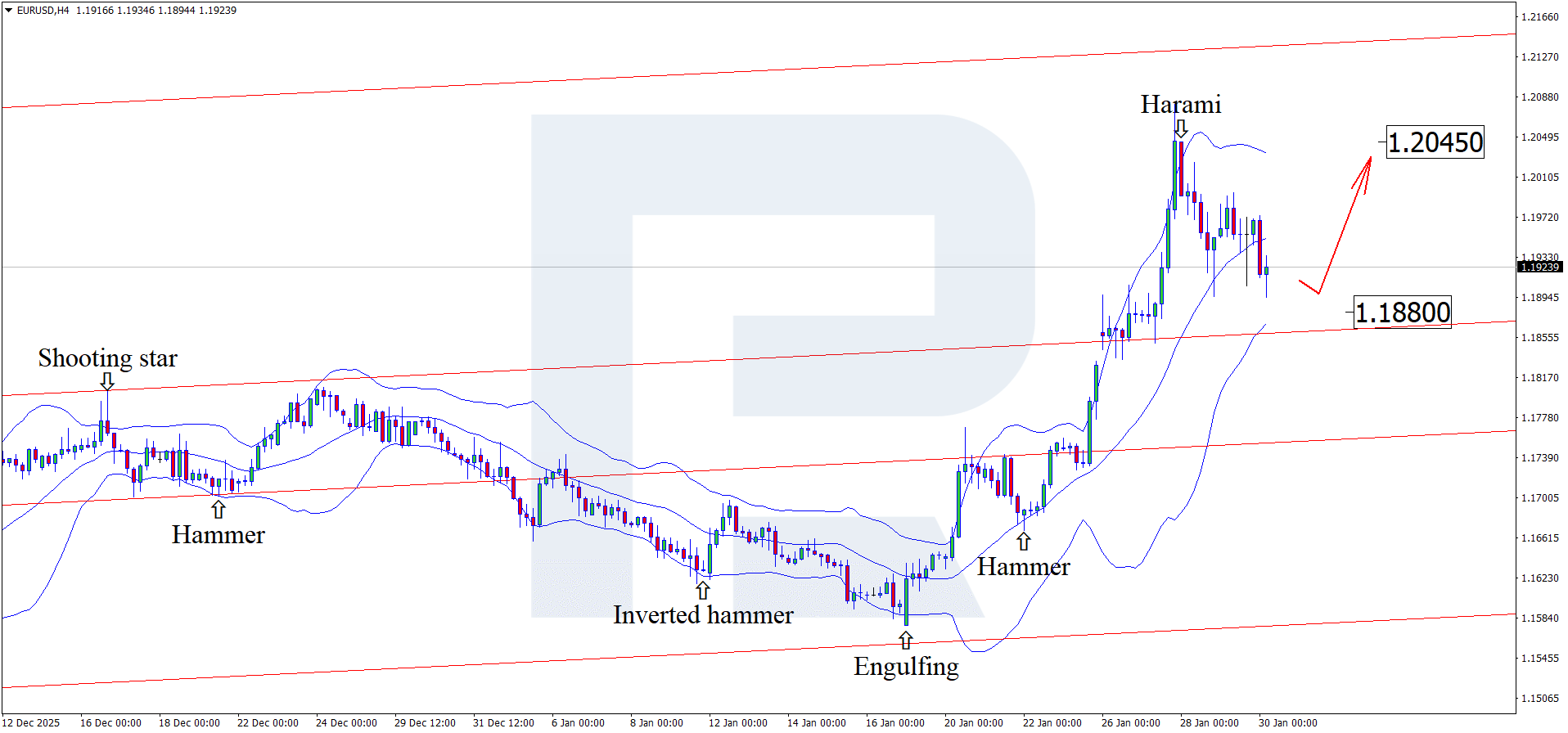 H4 графигінде EURUSD жұбы жоғарғы Bollinger Band маңында Harami реверстік үлгісін қалыптастырды. Осы кезеңде баға үлгі сигналына сәйкес түзету толқынын жалғастыруда. Котировкалар өсуші арна ішінде қалғандықтан, олар 1.1880 деңгейіне қарай жылжуы мүмкін. Осы деңгейден серпіліс жоғары қозғалыстың жалғасуына жол ашуы ықтимал.