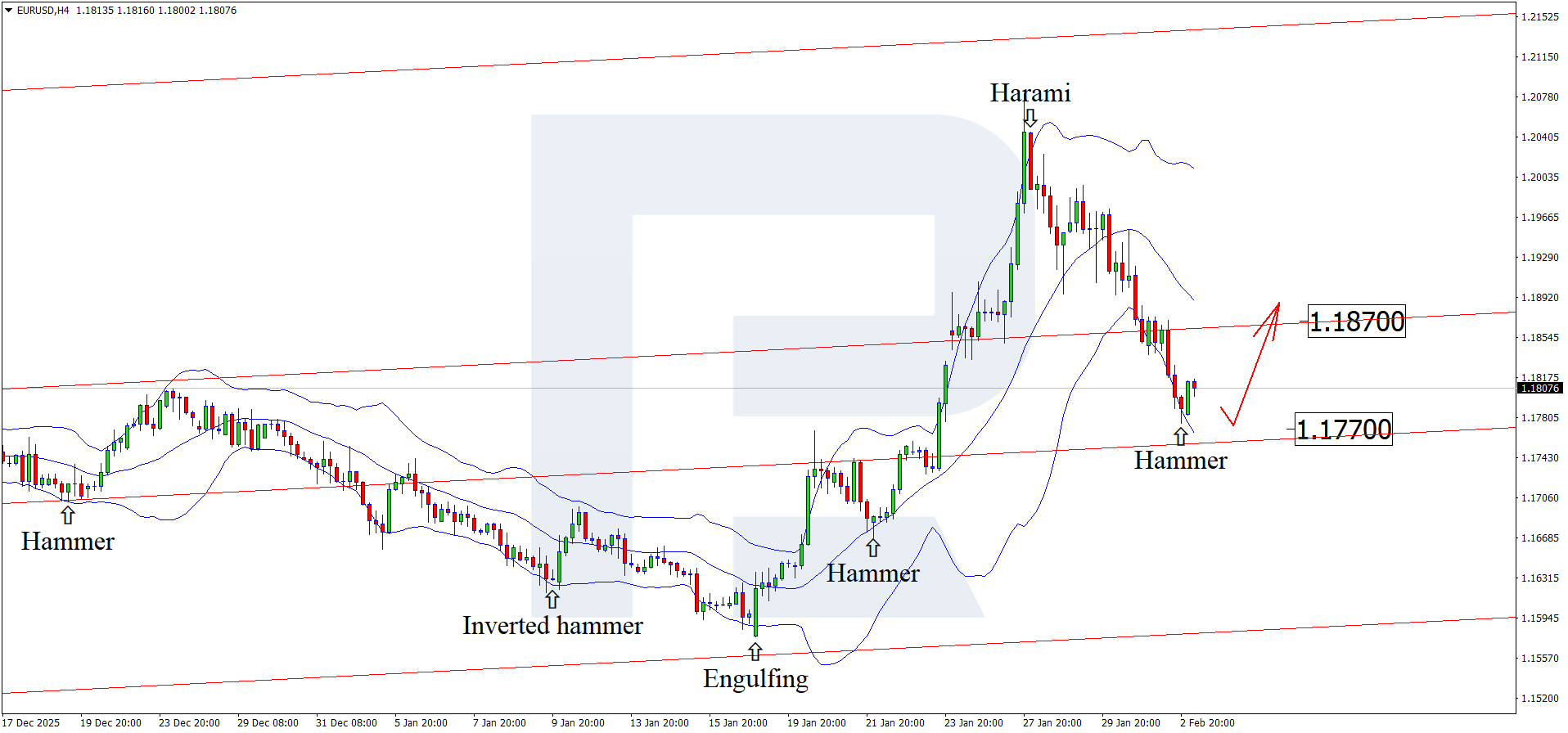 H4 графигінде EURUSD жұбы Bollinger Bands төменгі жолағы маңында Hammer кері бұрылу шам үлгісін қалыптастырды. Қазіргі кезеңде жұп осы сигналға сәйкес өсу толқынын дамытып жатыр. Баға өсуші арнаның ішінде қалып отырғандықтан, 1.1870 деңгейіне қарай қозғалыс мүмкін. Осы деңгейден жоғары бұзылу әрі қарай өсуші импульске жол ашады.