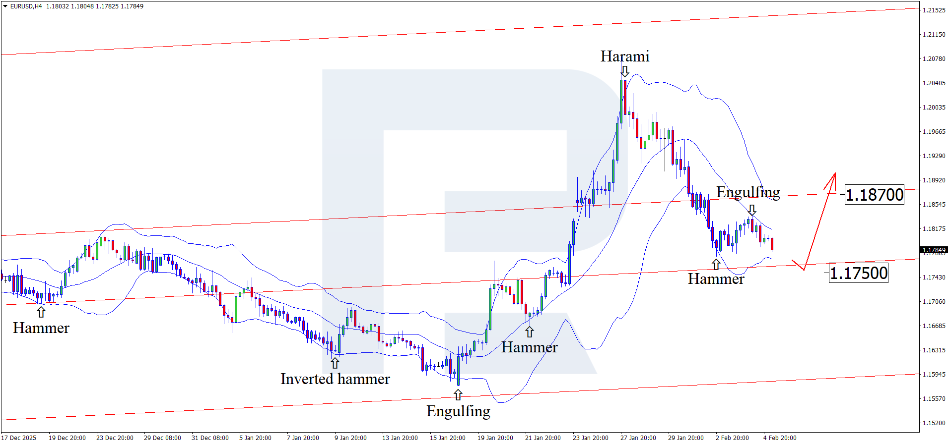 H4 графигінде EURUSD жұбы ортаңғы Bollinger Bands маңында Engulfing бұрылыс үлгісін қалыптастырды. Қазіргі кезеңде жұп үлгінің сигналына сәйкес түзетуші толқынды дамытып жатыр. Котировкалар өсуші арнаның ішінде қалғандықтан, баға 1.1750 деңгейіне қарай бағыт алуы мүмкін. Осы деңгейден серпіліс жалғасқан өсуші импульске жол ашуы ықтимал.