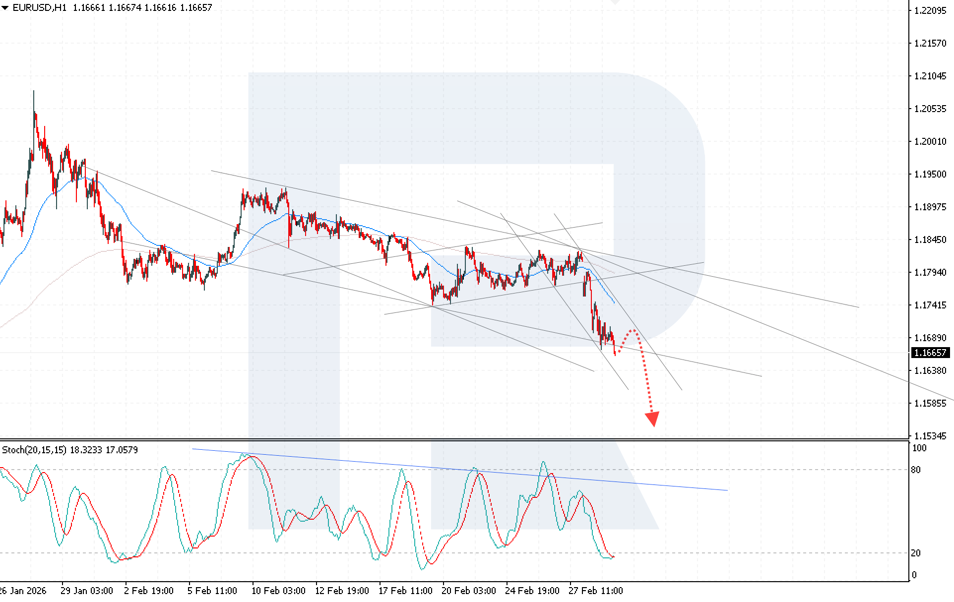 Бүгінгі EURUSD болжамы 1.1555 деңгейіне қарай әрі қарайғы төмендеуді болжайды. Бұған дейін төмендеуші арнаның жоғарғы шекарасына дейін шағын түзету болуы мүмкін, содан кейін сатушылар импульсты қайта күшейтуі ықтимал. Техникалық көрініс аюлы болып қалуда. Stochastic Oscillator сату қысымының артып жатқанын растайды. Сонымен қатар, индикатор артық сатылған аймақта орналасқан, бұл төмендеуге дейін қысқа мерзімді түзету ықтималдығының жоғары екенін көрсетеді.