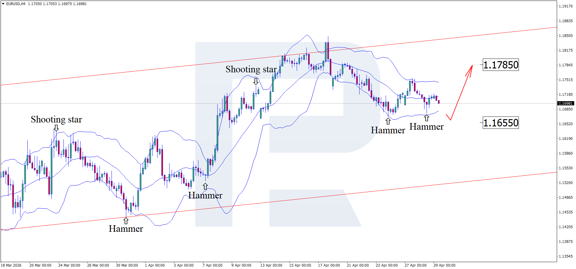 H4 графигінде EURUSD жұбы Bollinger Bands төменгі шекарасы маңында Hammer бұрылу моделін қалыптастырды. Осы кезеңде котировкалар сигналға сәйкес жоғары толқын қалыптастыруы мүмкін. Бағалар өсуші арна ішінде болғандықтан, 1.1785 қарсылық деңгейі мақсат ретінде қарастырылуы мүмкін. Осы деңгейден жоғары бұзылу әрі қарай өсу импульсін ашады.
