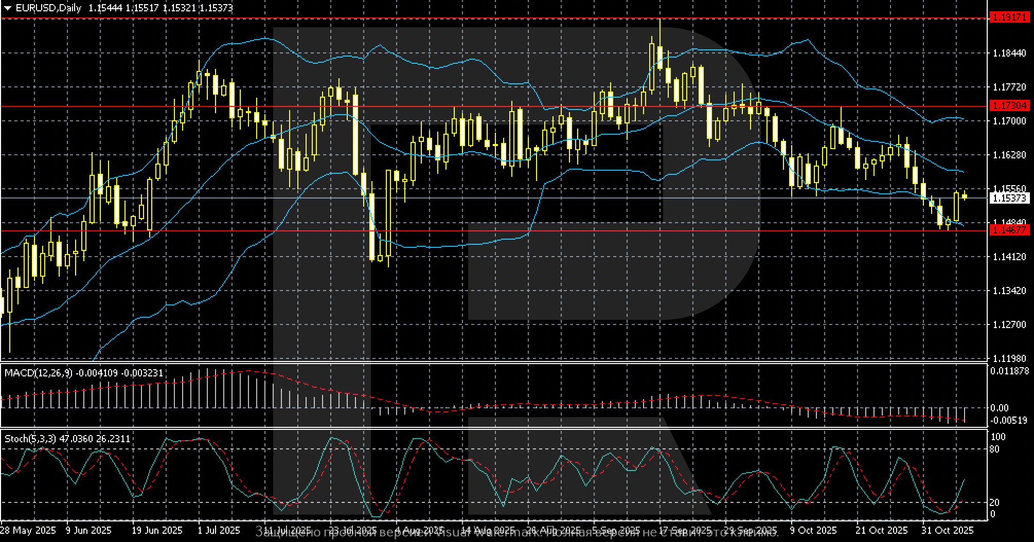 Техникалық тұрғыдан жұп 1.1470–1.1600 диапазонында қалып отыр. MACD және Bollinger Bands төмендеу импульсының әлсіреуін көрсетсе, Stochastic қысқа мерзімді серпіліс ықтималдығын білдіреді. Алайда, баға әзірге 1.1600 жоғары орныға алмай, өсу әлеуетін шектеп тұр.