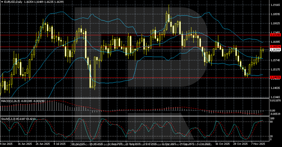 Күндізгі графикте EURUSD жұбы қазан айының соңындағы төмендеуден кейін қалпына келуде. Баға 1.1635–1.1640 аймағына дейін көтерілді, бірақ бірнеше рет тосқауыл болған негізгі 1.1657 қарсылық деңгейінен төмен қалып отыр.