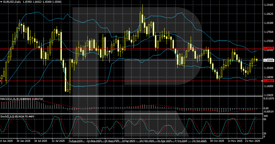 MACD оң аймақта, бірақ гистограмма айтарлықтай қысқарып, қазан айындағы максимумнан кейінгі «bullish» импульстың әлсіреуін және жанама қозғалысқа ауысуды көрсетеді. Stochastic Oscillator 80–85 аралығында, шамадан тыс сатып алынған аймаққа кіріп, қысқа мерзімді түзету немесе өсу үзілісінің ықтималдығын білдіреді.