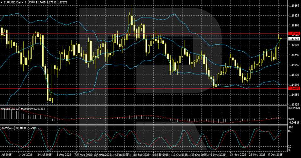 Күндік графикте EURUSD қарашадағы түзетуден кейін қалпына келуін жалғастыруда. Баға 1.1730–1.1750 аймағына қайта оралып, ағымдағы диапазонның жоғарғы шекарасына және 1.1754 негізгі қарсылығына жақындады. Жұп Bollinger орта жолағынан жоғары саудаланып, сатып алушылар күшінің артқанын көрсетеді.
