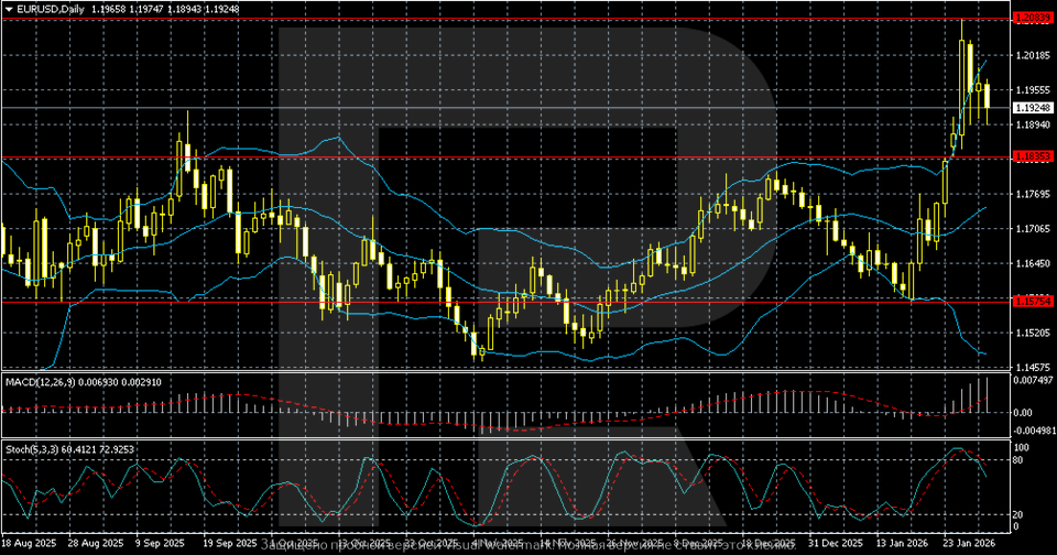 EURUSD жұбы АҚШ долларының әлсіздігі аясында 1.1924 деңгейі маңында қалып отыр. Доллар геосаяси шиеленістер мен Трамп әкімшілігінің экономикалық саясатына қатысты белгісіздік салдарынан қысымда, оның ішінде тарифтік қауіптер мен Иран айналасындағы эскалация тәуекелі бар. 2026 жылғы қаңтарда ФРЖ мөлшерлемені 3.50–3.75% деңгейінде өзгертпей қалдырды, ал FOMC ішіндегі келіспеушіліктер мен инфляцияға қатысты жұмсақ пікірлер биылғы жылы саясатты жұмсарту күтулерін қолдады.