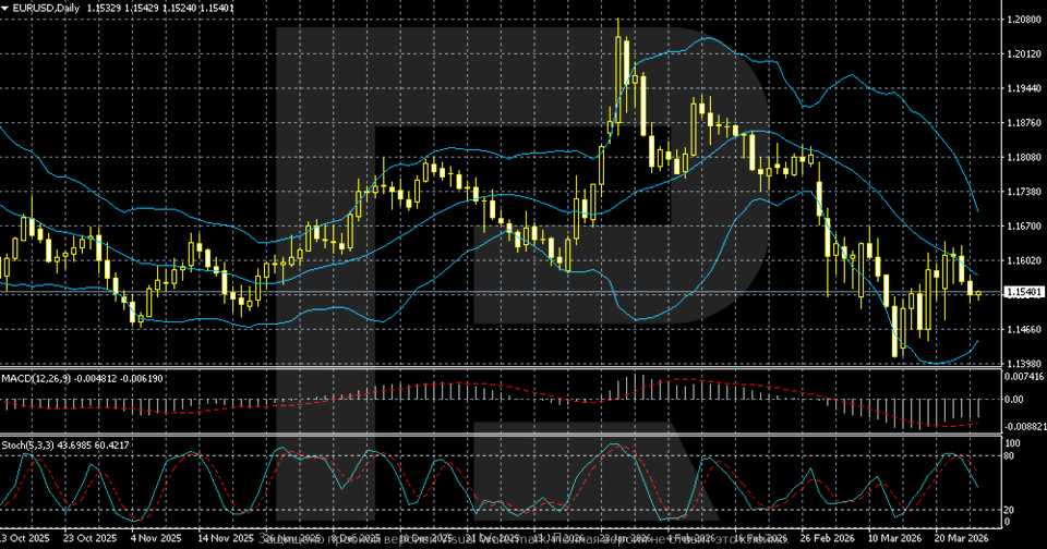 Техникалық тұрғыдан жұп қаңтарда 1.2000 аймағына дейін өскеннен кейін төмендеу фазасына өтті. Ақпанның соңынан бері төменгі максимумдар мен минимумдардан тұратын аюлы (bearish) құрылым қалыптасуда. Наурыз басында төмендеу жеделдеп, 1.1400 деңгейіне жетті, содан кейін түзету басталды. Қазір баға Bollinger Bands орта сызығынан төмен 1.1450–1.1650 диапазонында қозғалады. MACD теріс аймақта, ал Stochastic Oscillator қысқа мерзімді артық сатып алу жағдайын көрсетеді. Қарсылық деңгейі 1.1650–1.1700 аймағында.