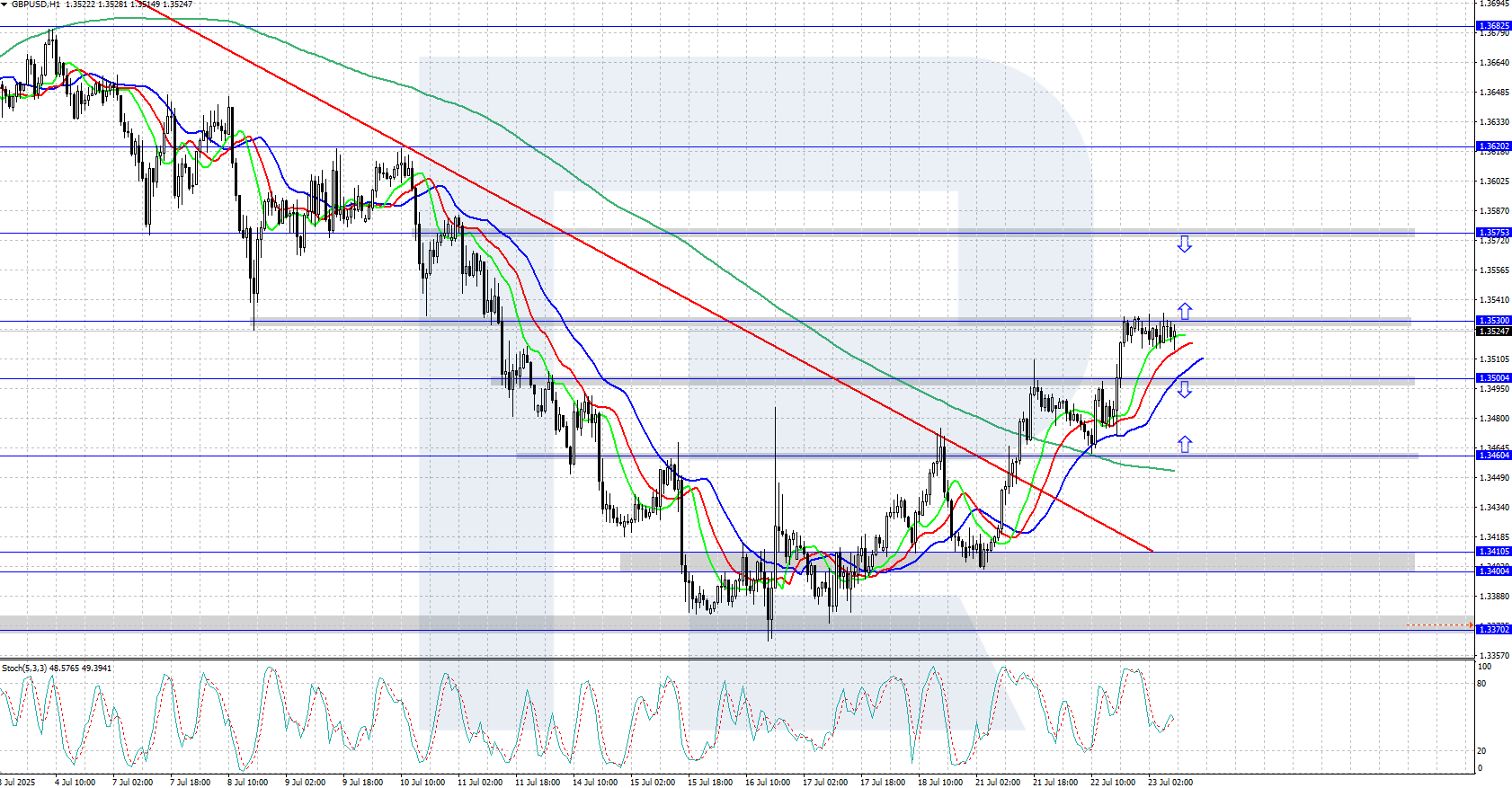 H4 диаграммасында GBPUSD жұбы 1.3370 деңгейіндегі күндік қолдаудан серпіліп, жоғары бағыттағы айқын импульсті көрсетуде. Alligator индикаторы жоғары бағытта бұрылып, тұрақты түрде көтерілуде – бұл өсу үрдісінің жалғасуы мүмкін екенін көрсетеді.