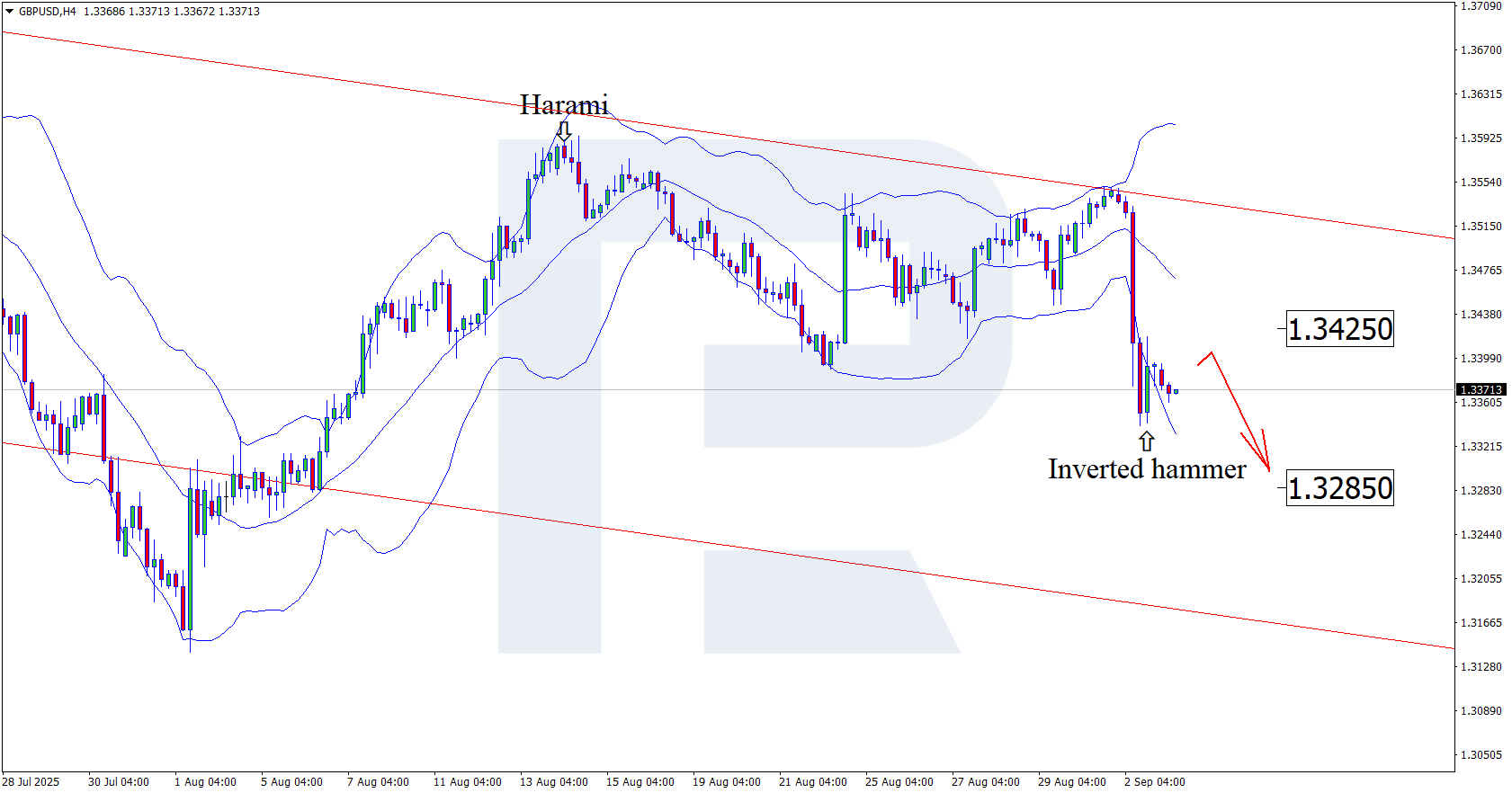 H4 графигінде GBPUSD жұбы төменгі Bollinger Bands деңгейін тексеріп, «Inverted Hammer» кері бұрылу үлгісін қалыптастырды. Қазіргі сәтте жұп осы сигналға сәйкес түзету толқынын дамытуы мүмкін. Баға күрт төмендегеннен кейін төмендеу арнасында тұрғандықтан, түзетуші серпіліс ықтимал.