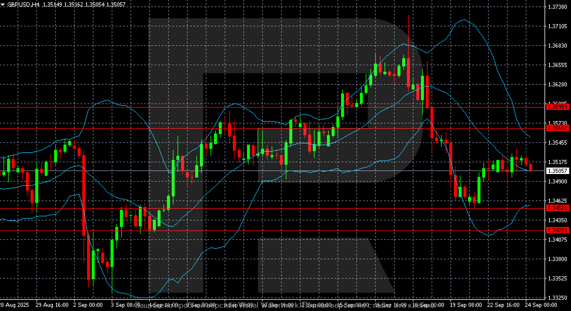 Тамыздың соңынан 24 қыркүйекке дейінгі GBPUSD H4 графигінде алдымен өсу, кейін құлдырау байқалады. Қыркүйек басында котировкалар 1.3450–1.3520 диапазонында болды. Кейін өсім басталып, 18 қыркүйекте шамамен 1.3710 шыңына жетті. Алайда 20 қыркүйекте нарық шамамен 200 пунктке құлап, 1.3500 деңгейіне қайта түсті.