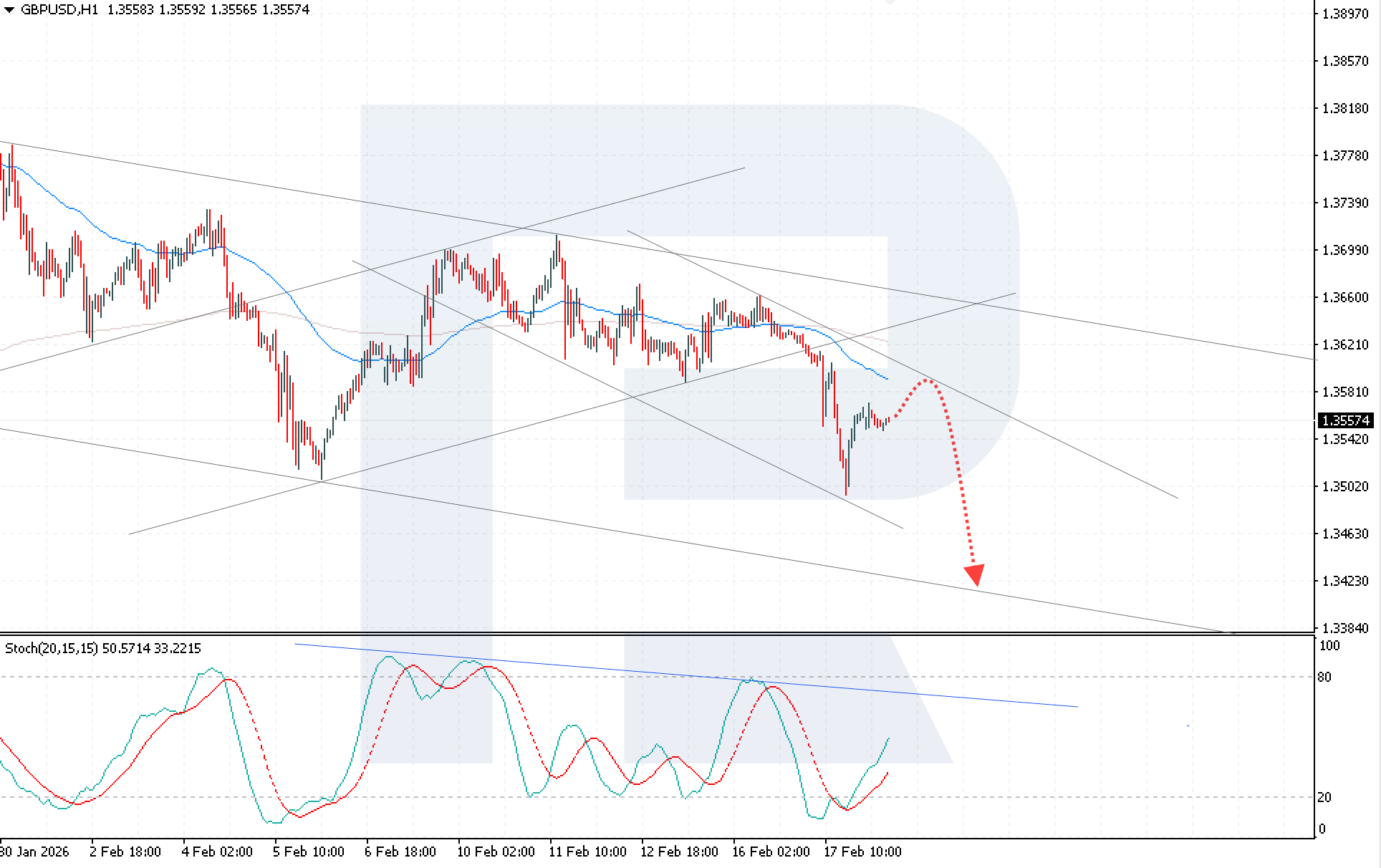 GBPUSD бойынша бүгінгі болжам төмендейтін арнаның жоғарғы шекарасынан кері серпілістен кейін 1.3420 деңгейіне қарай қайта төмендеуді болжайды. Қазіргі техникалық құрылым аюлы сценарийдің әлеуеті сақталғанын көрсетеді. Stochastic Oscillator артық сатылу аймағынан шығып, төмендейтін қарсылық сызығына жақындады, бұл әрі қарай өсуге шектеу қойып, жаңа сатылым толқынын тудыруы мүмкін.