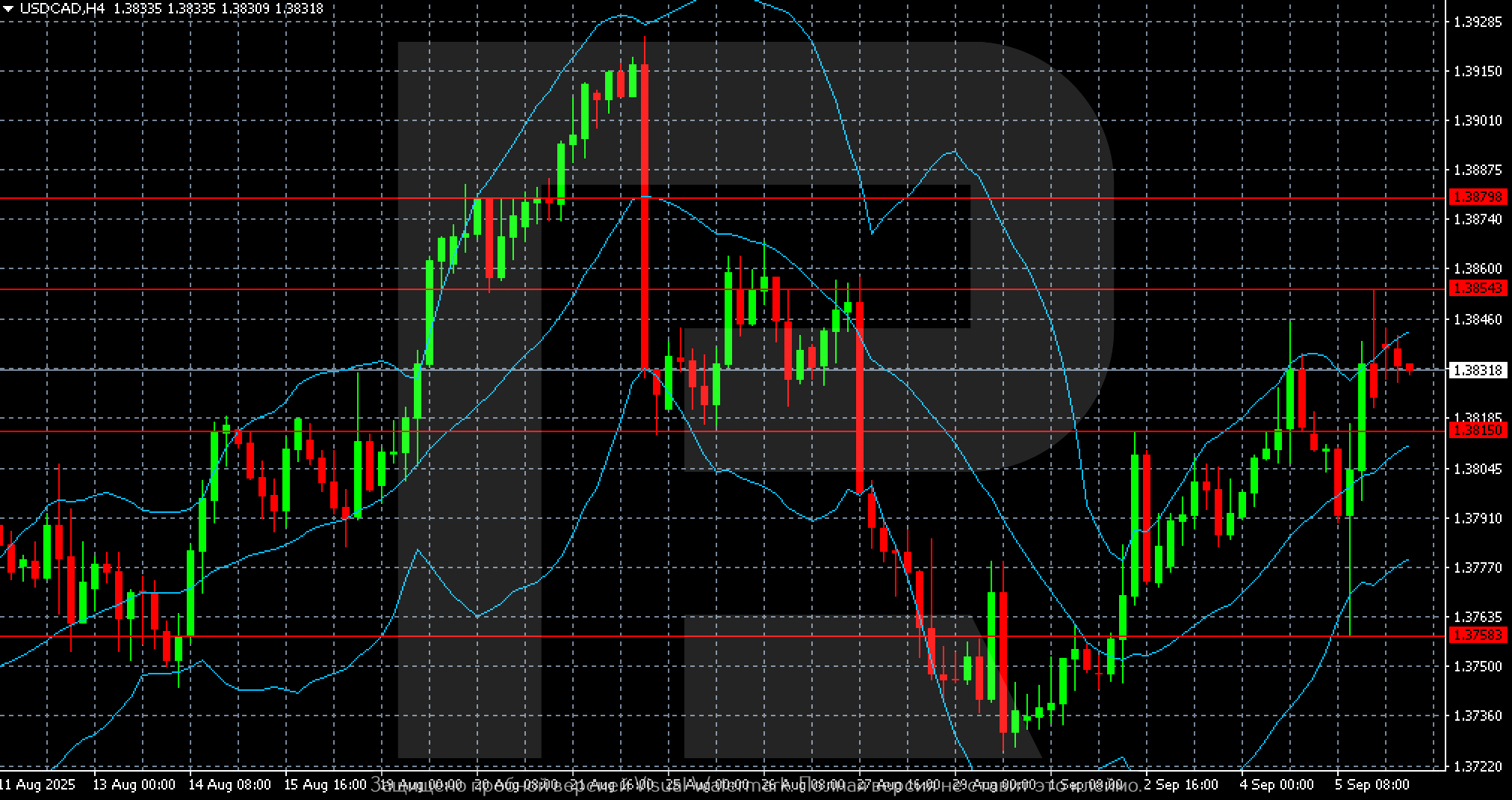 USDCAD H4 графигінде тамыздың соңында 1.3920–1.3930 аймағынан төмендегеннен кейін баға 1.3758 маңында қолдау тапты да, жоғары серпілді. Қазіргі уақытта жұп шамамен 1.3830 маңында консолидацияда тұр. Ең жақын қолдау деңгейі – 1.3815, негізгі қолдау – 1.3758. Қарсылық 1.3854–1.3879 аймағында орналасқан. Осы аймақтан жоғары бұзылу жұпты 1.3920–1.3930 шыңдарына қайта жеткізуі мүмкін.
