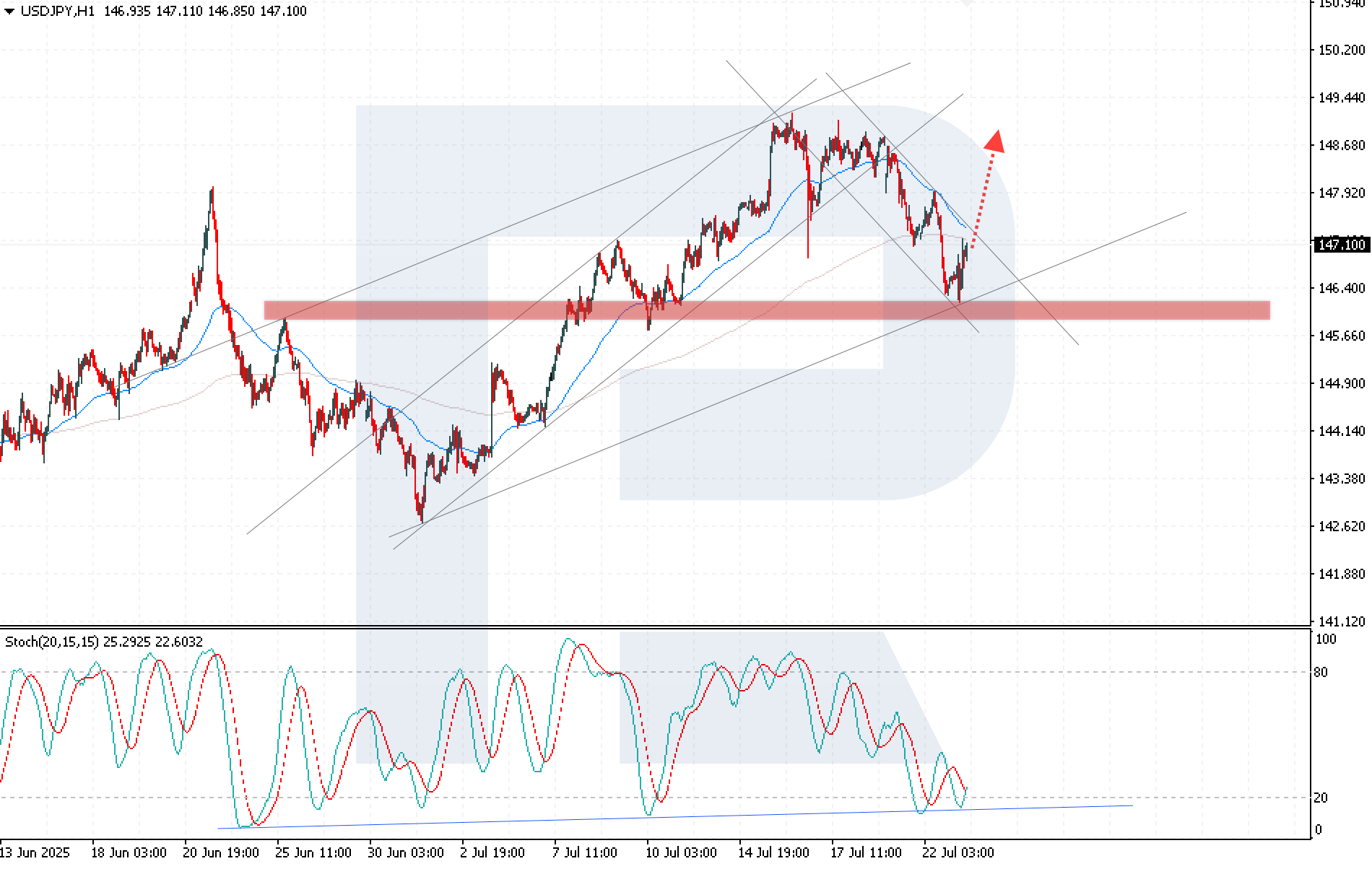 USDJPY жұбы 146.25 деңгейіндегі негізгі қолдау нүктесінен серпіліп, бұқа қысымы күшейіп келеді. Қазіргі котировка – 147.10. 2025 жылғы 23 шілде күнгі толық талдауды төменнен оқыңыз.