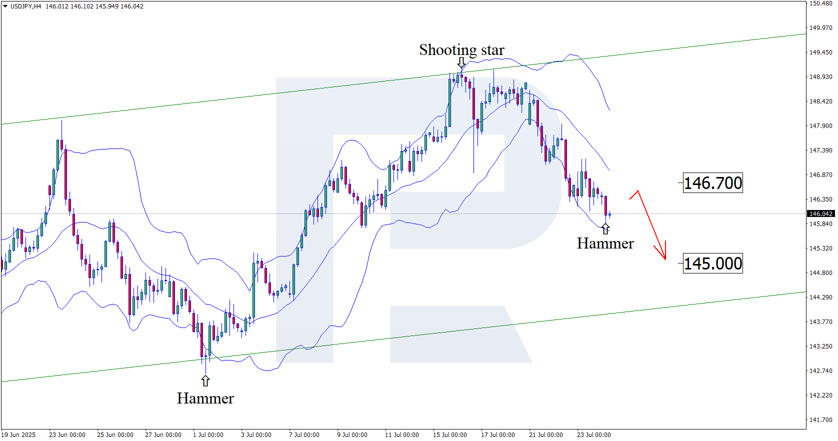 Жапонияға арналған тарифтердің 15%-ға дейін төмендетілуі иенаның нығаюына себеп болды. Осы жағдай аясында USDJPY бағамы 145.00 деңгейіне дейін төмендеуі мүмкін. 2025 жылғы 24 шілде күнгі толық талдауды төменнен оқыңыз.