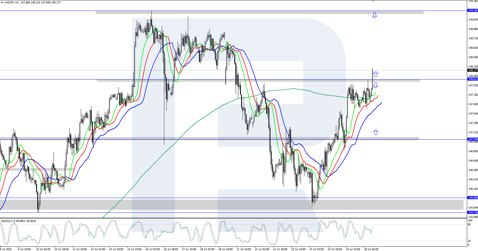 USDJPY жұбы аптаның маңызды ақша-несие саясаты шешімдері қарсаңында 148.00 деңгейінен жоғары көтеріліп, біртіндеп нығаюда. 2025 жылғы 28 шілде күнгі толық талдаумен танысыңыз.