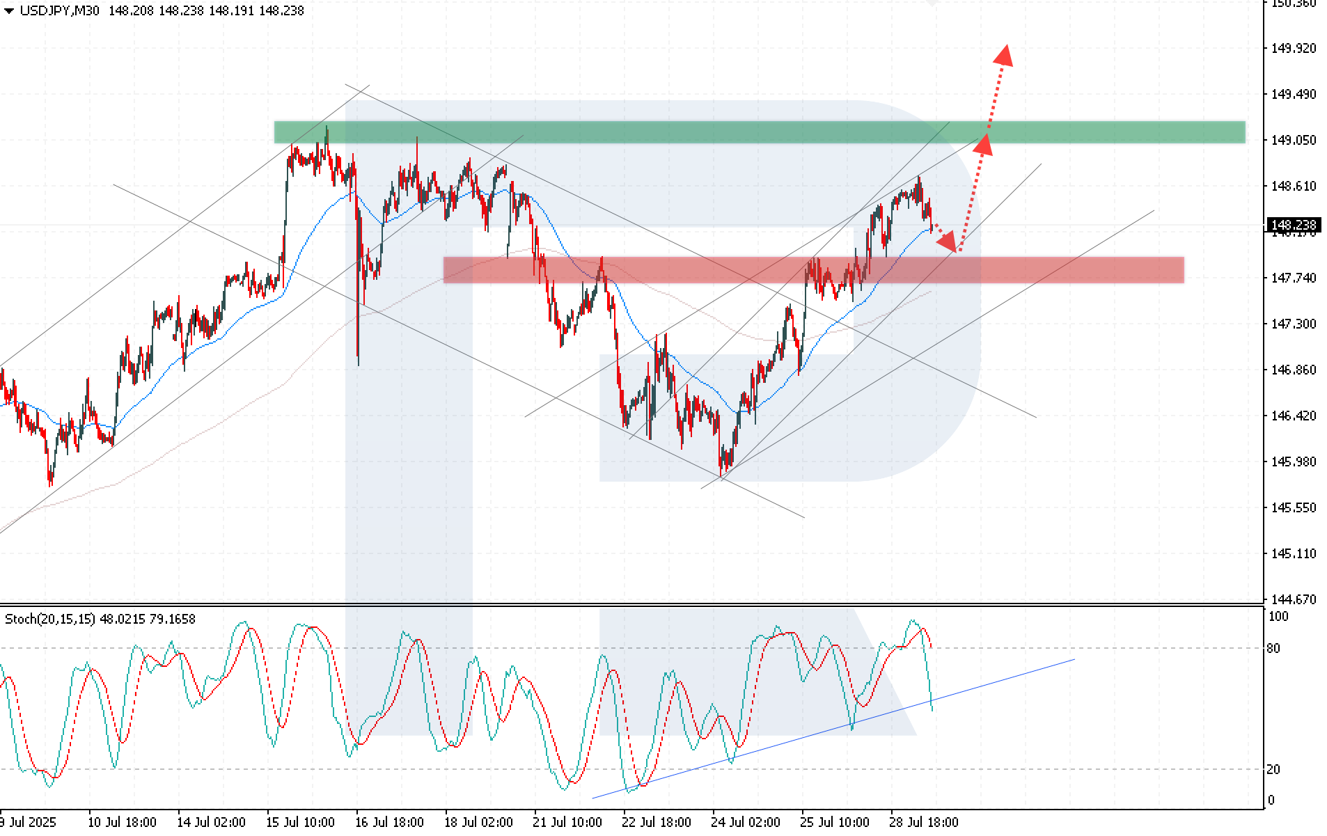 USDJPY жұбы ақша-несие шешімдері мен АҚШ-тың сауда мәлімдемелерін күтуде тұрақтануда. Қазіргі баға – 148.23. 2025 жылғы 29 шілде күнгі толық талдауымызды оқыңыз.