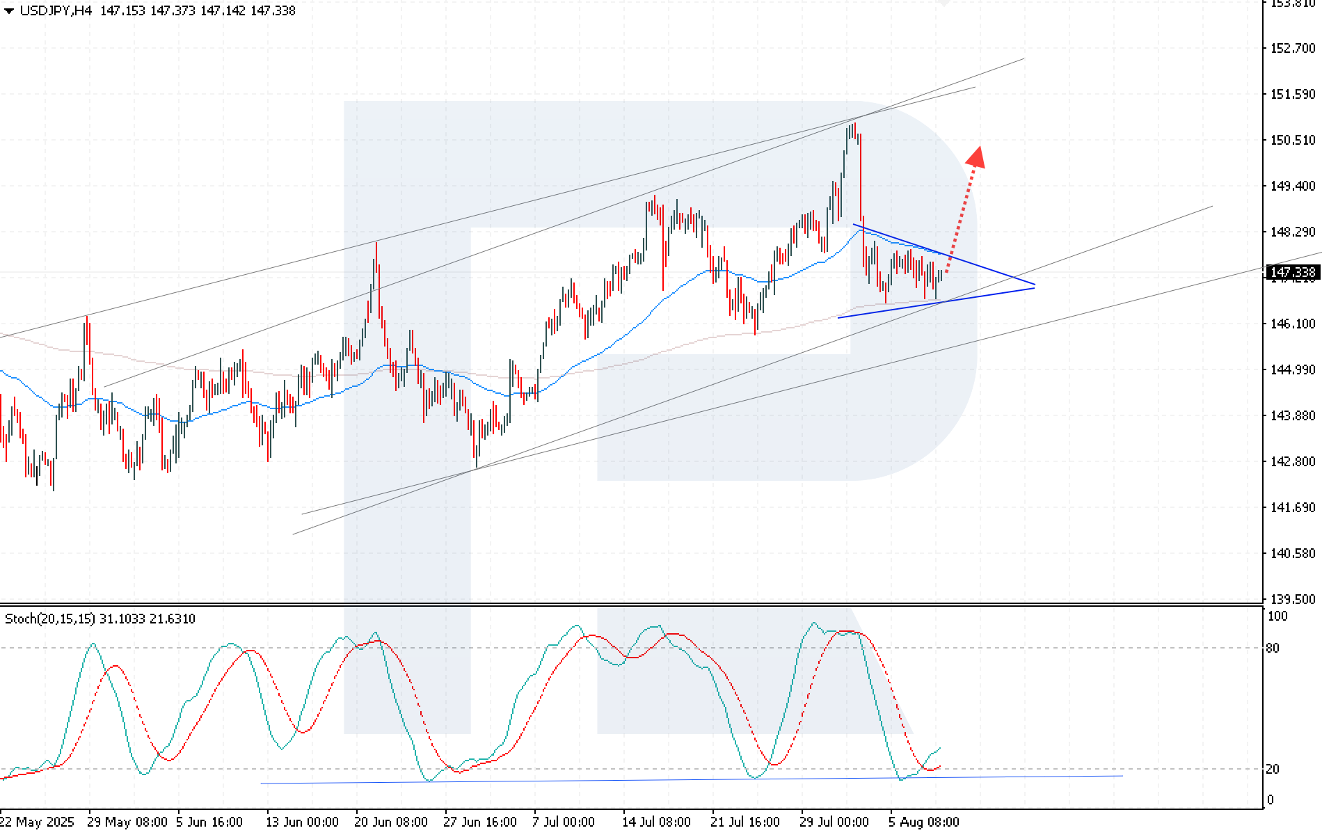 USDJPY бағамы өсіп келе жатқан арна ішінде қозғалып, Triangle үлгісін 146.65 негізгі қолдау деңгейінің үстінде қалыптастыруда. H4 графигінде баға 285 кезеңдік жылжымалы орташа мәннен жоғары тұр, бұл сатып алушылардың басымдығын көрсетеді. Диапазонның тарылуы және Triangle үлгісінің қалыптасуы шекаралардың біреуі бұзылған соң қозғалыстың жеделдеу ықтималдығын арттырады.