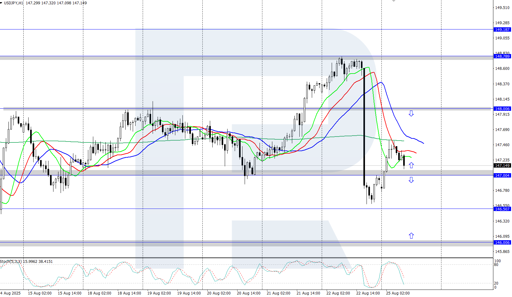 USDJPY жұбы төмендеп, 147.00 аймағына түсті. Жексон Хоул симпозиумында Кадзуо Уэданың пікірлері Жапония Банкі алдағы уақытта мөлшерлемені көтеруі мүмкін екенін көрсетті.