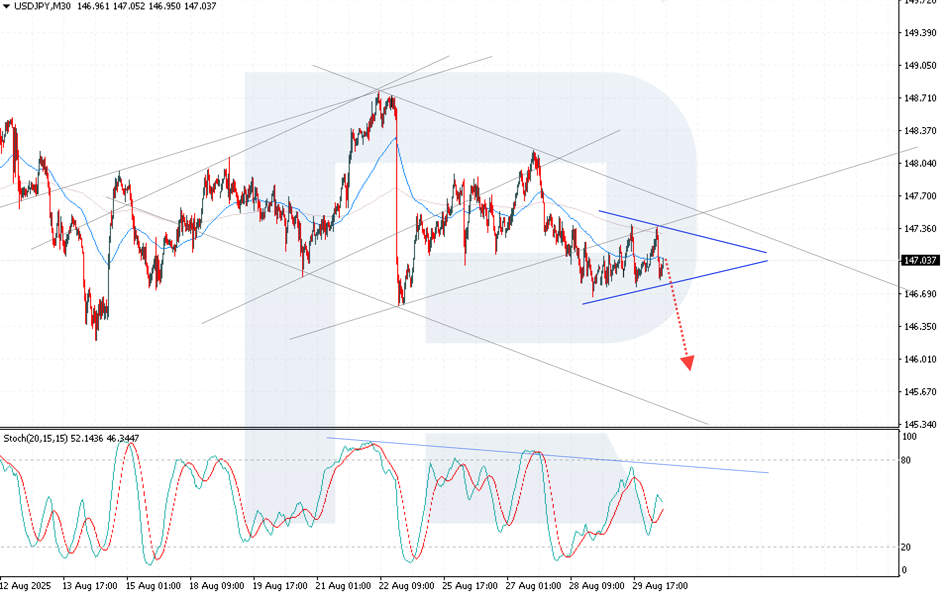 Ағымдағы USDJPY болжамы 146.05 қолдау деңгейінен төмен бұзылу тәуекелінің сақталуын және ФРЖ мөлшерлемені төмендетуі мүмкін деген күтулер мен Жапония банкінің ықтимал қатаңдатуы қысымында аюлы трендтің дамуын көрсетуде. USDJPY техникалық талдауы да төмен бағыттағы сценарийді растап отыр, «Үшбұрыш» үлгісінің төменгі шекарасынан төмен бұзылудың 145.95 мақсатына жету ықтималдығы жоғары екенін білдіреді.