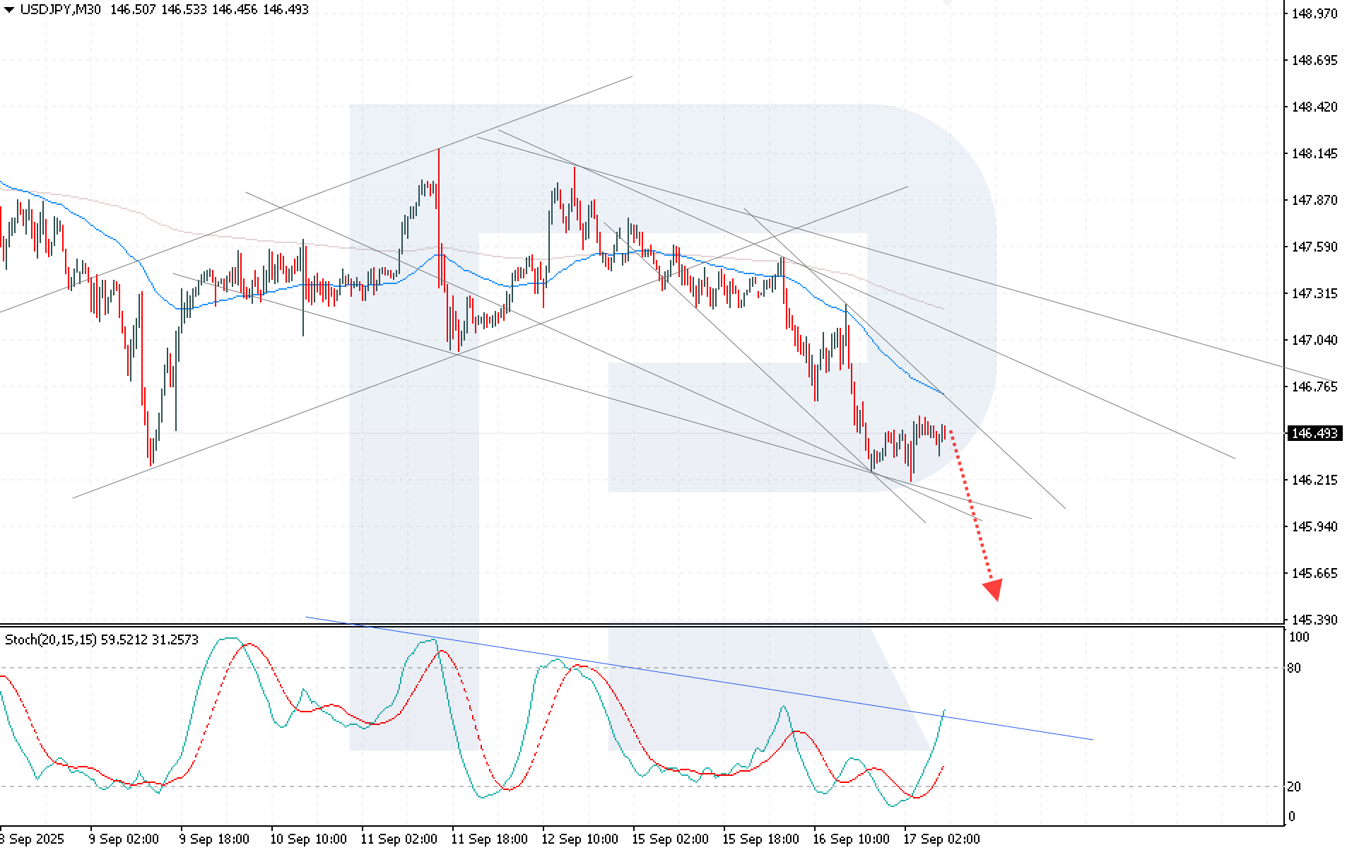 Бүгінгі USDJPY болжамы «аюлық» сценарийді меңзейді, жұп 145.35 деңгейіне дейін төмендеуі ықтимал. Стохастикалық осциллятор артық сатып алу аймағына өтіп, кері бұрылу сигналын қалыптастыруда, бұл ықтимал түзетуді растайды.