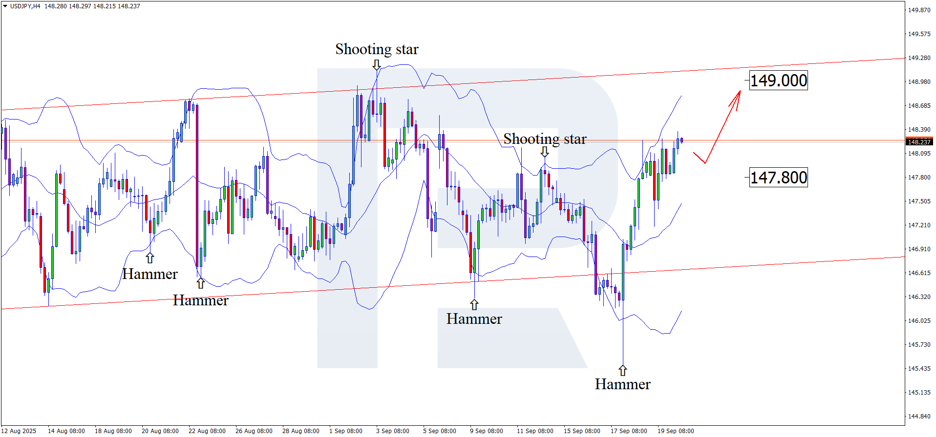 22 қыркүйек 2025 ж. арналған болжамда USDJPY жұбы бычьи толқынды қалыптастырып, шамамен 148.20 деңгейінде саудалануда.