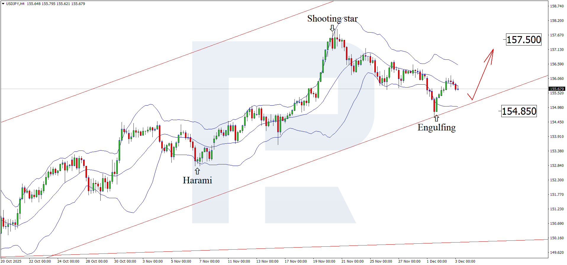 3 желтоқсан 2025 күнгі болжамға сәйкес USDJPY жұбы түзету қозғалысын жалғастырып, 155.80 маңында саудалануда.