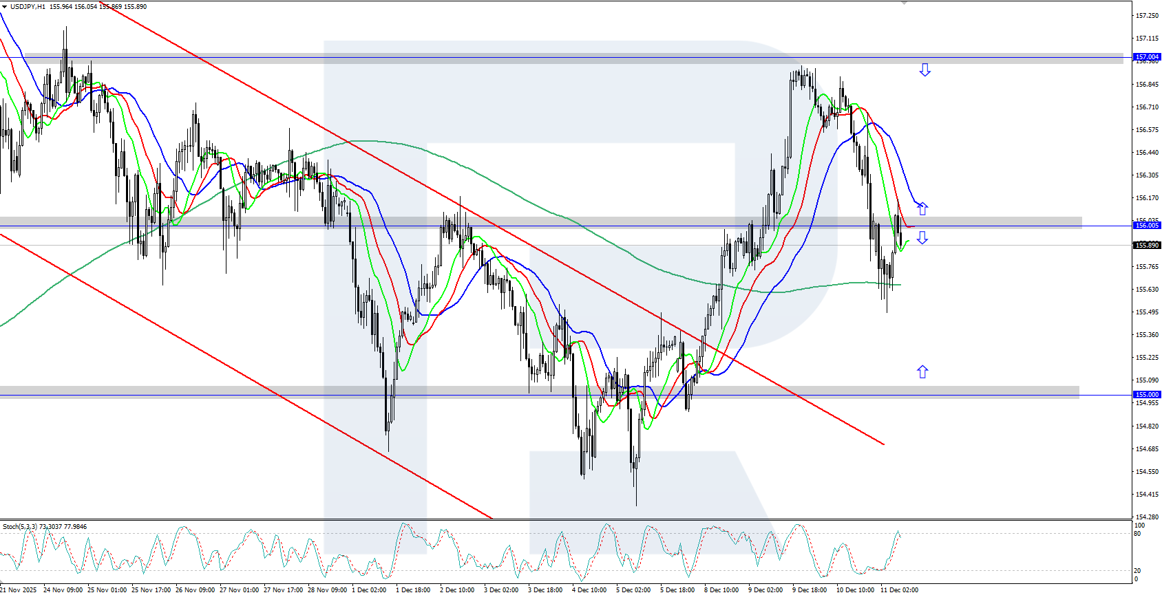 USDJPY төмендеп, ФРЖ мөлшерлемені қысқартқаннан кейін 156.00 деңгейінен сырғып өтті. Толық ақпарат — 2025 жылғы 11 желтоқсан арналған талдауда.