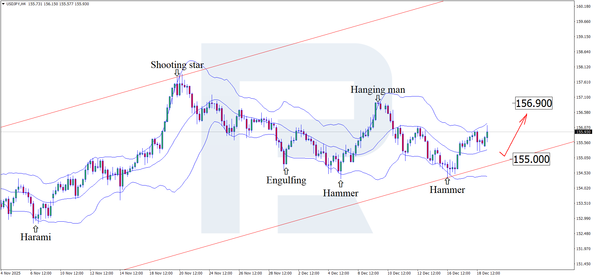 19 желтоқсан 2025 жылға арналған перспектива JPY үшін онша оң көрінбейді. USDJPY жұбы жоғары бағытталған толқынды қалыптастырып, шамамен 156.00 деңгейінде саудалануда.