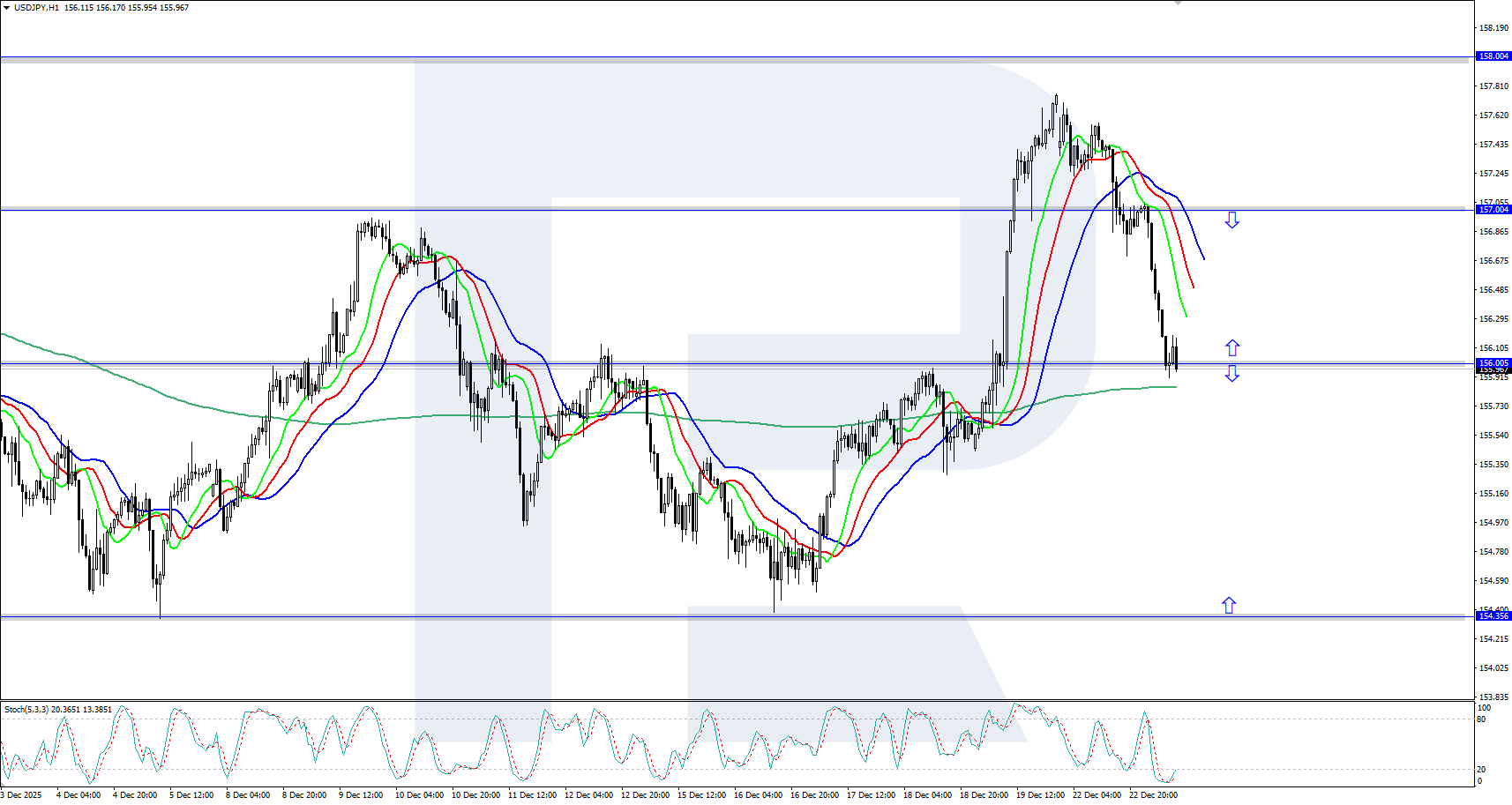 USDJPY төмендеуде, Жапония тарапынан валюта ауытқуларын тежеу үшін шаралар қабылдануы мүмкін деген мәлімдемелер аясында 156.00 маңындағы аймаққа түсті. Толығырақ — 2025 жылғы 23 желтоқсан күнгі талдауымызда.