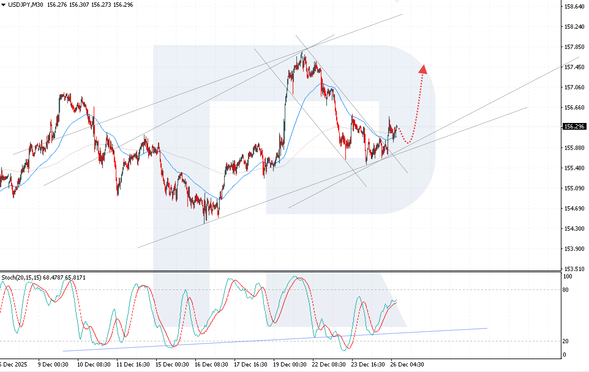 USDJPY Токиодағы инфляцияның әлсіреуі және Жапония Банкі (BoJ) саясатын қатаңдатуда үзіліс жасалуы мүмкін деген күтулер аясында қалпына келу қозғалысын көрсетуде. Ағымдағы баға — 156.29. Толығырақ — 2025 жылғы 26 желтоқсан күнгі талдауымызда.