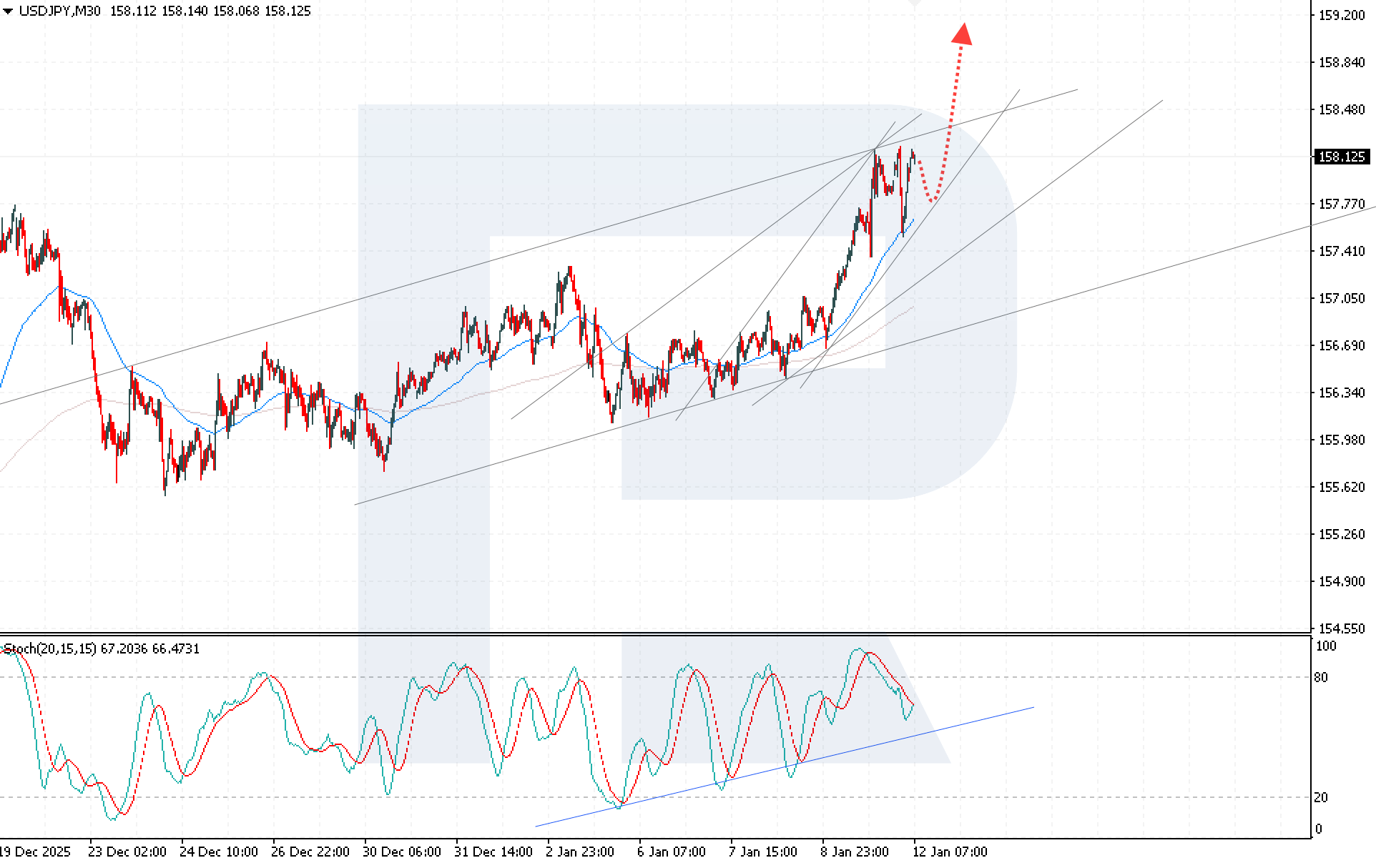USDJPY бағамы техникалық бұзылу және жапон иенасына фундаменталды қысымның күшеюі аясында өсуде. Ағымдағы котировка — 158.12. Толығырақ 2026 жылғы 12 қаңтар күніне арналған талдауымыздан біліңіз.