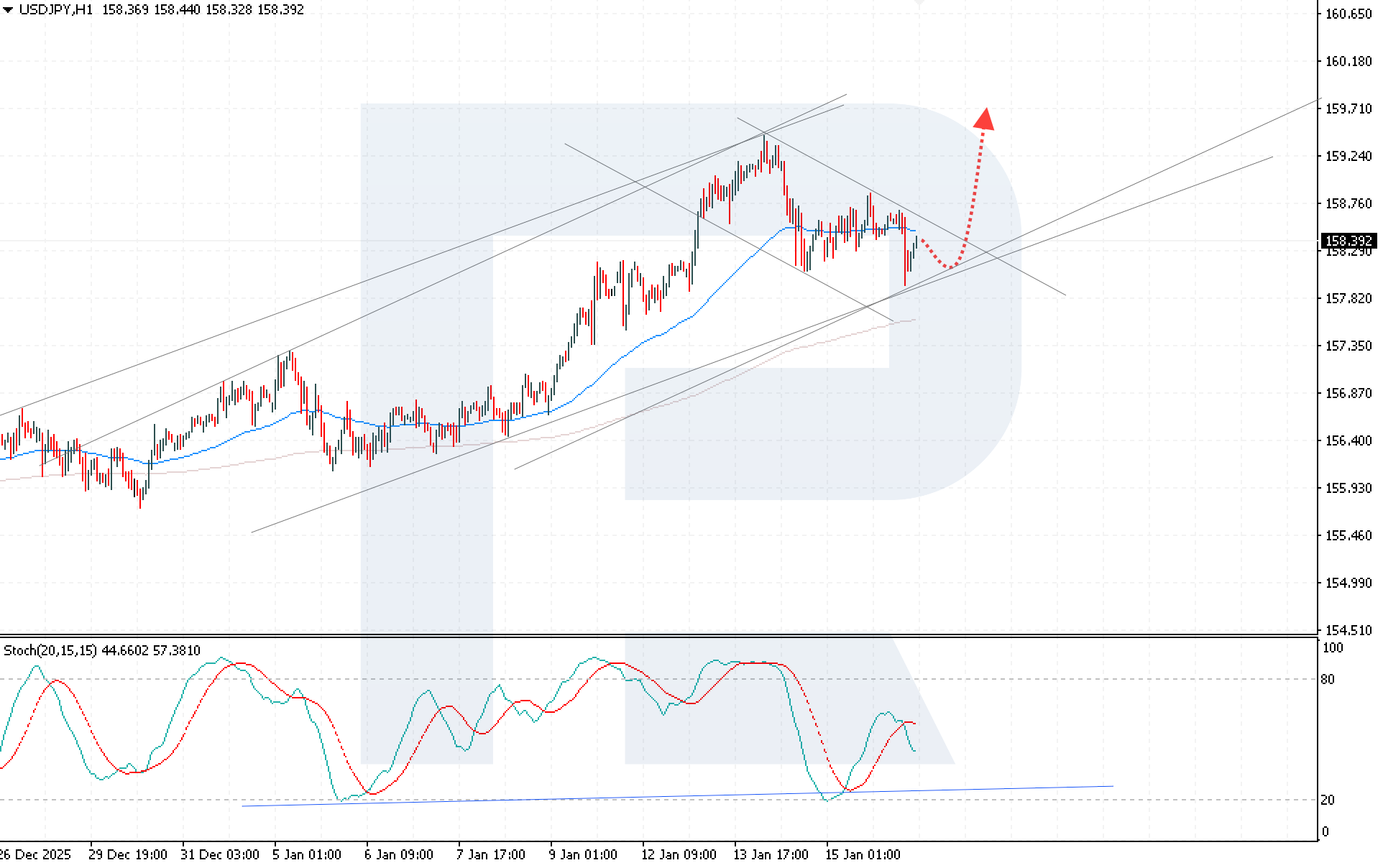 USDJPY өсуші тренді сақталған жағдайда, 158.05 деңгейіне қарай түзетуші төмендеу ұзын позиция үшін қолайлы жағдай жасауы мүмкін.